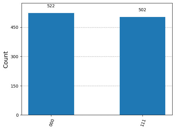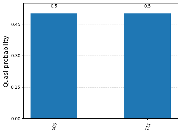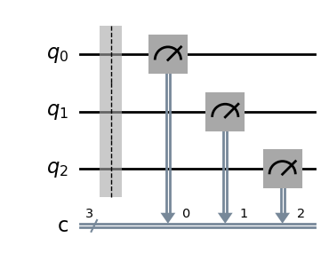 아래 코드는 Qiskit을 사용하여 3큐비트 양자 회로의 측정(measurement) 과 시뮬레이션 결과 분석을 수행하는 전체 흐름을 보여줍니다.