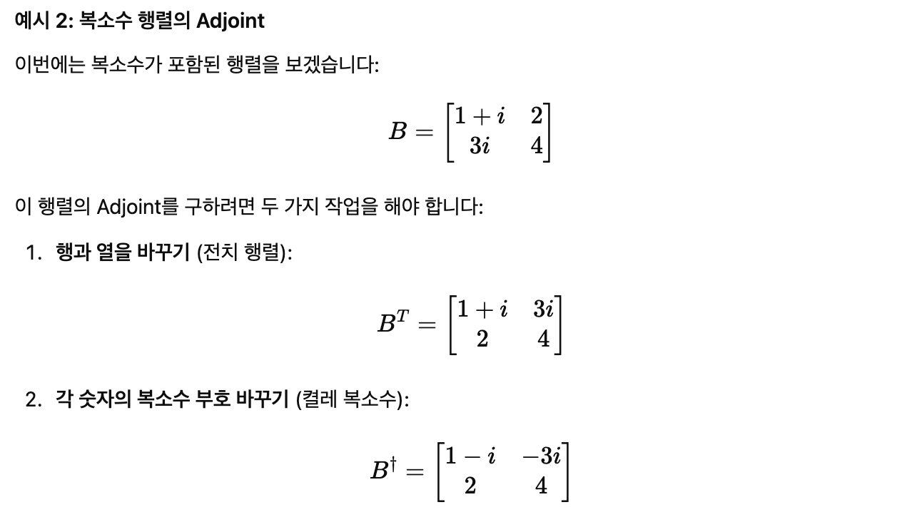 이를 이용하여, 복소수 행렬에서 adjoint를 구하는 예시는 아래 과정과 같다.