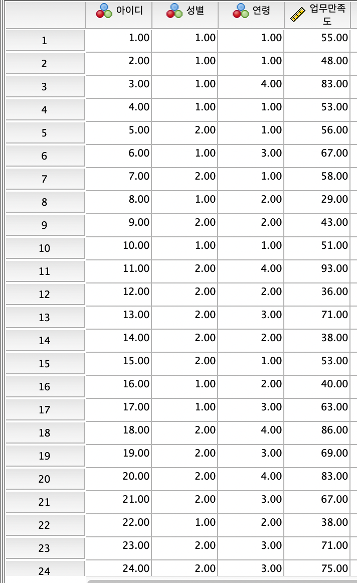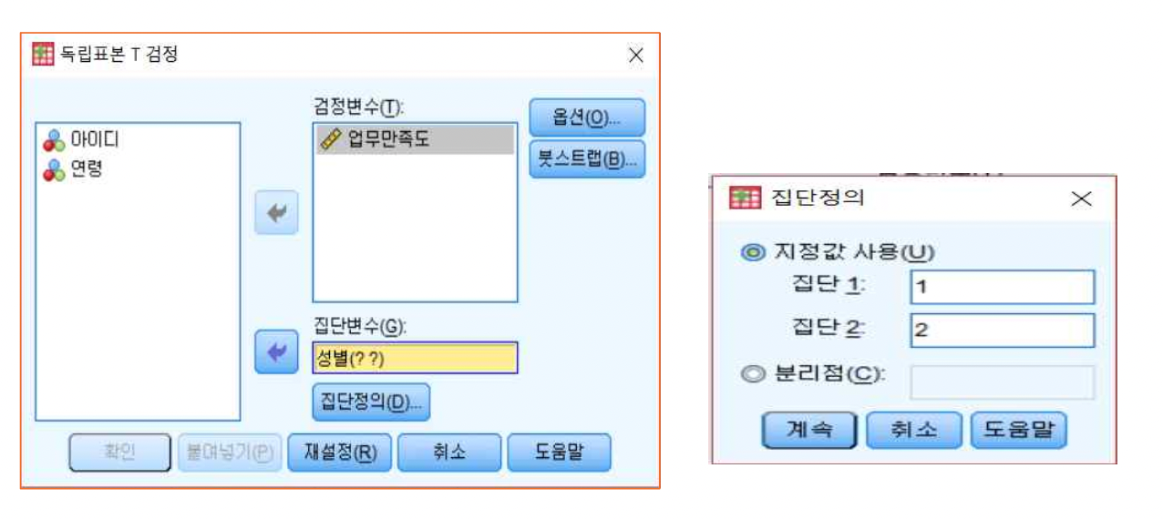 2. 검정변수에 업무만족도를 보내고 집단변수에 성별을 보낸다. 집단정의를 클릭하고 집단 1과 집단 2에 성별의 범주 값-여기서는 1과 2-을 입력한다.