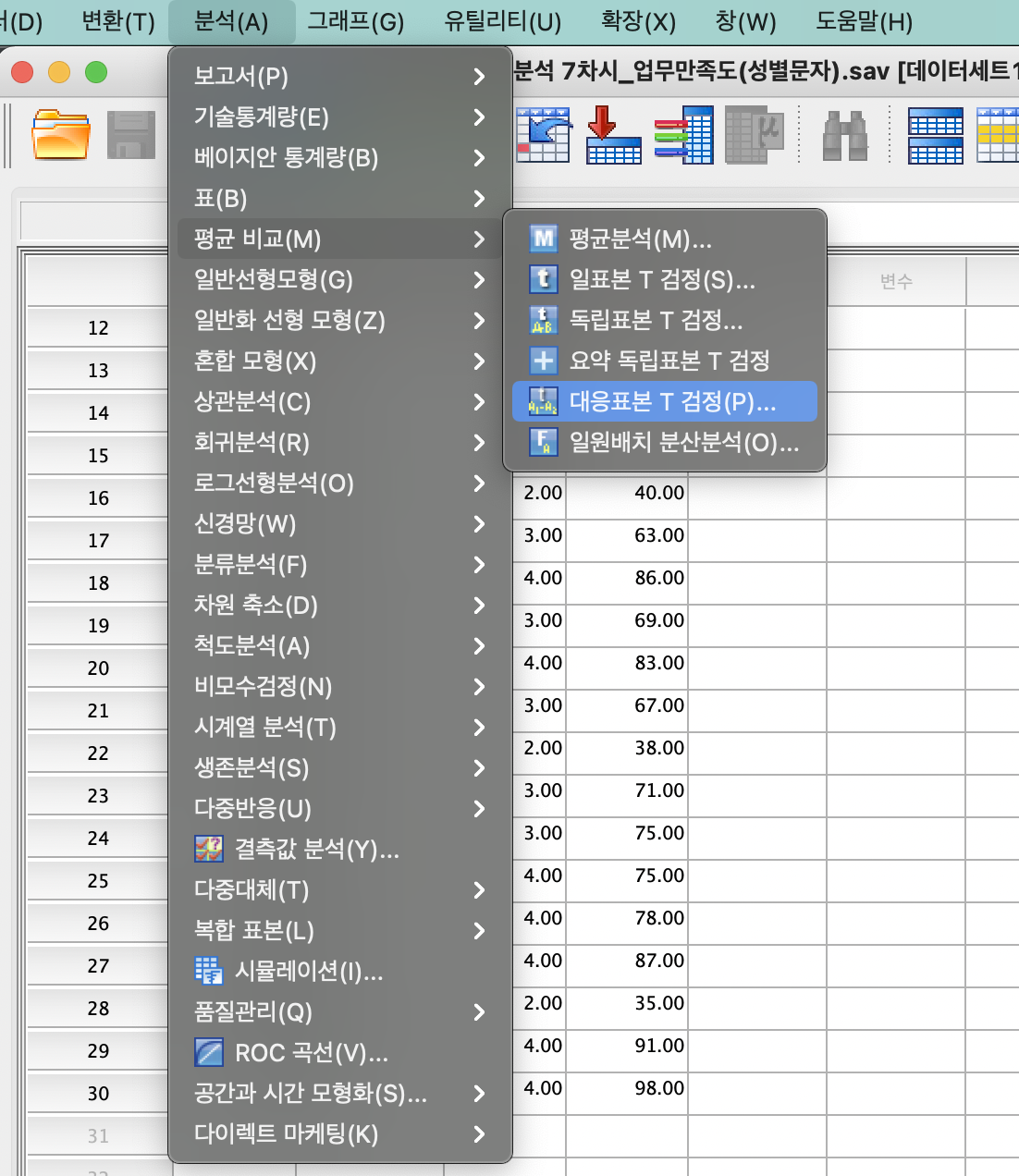 1. 분석 -> 평균비교 -> 독립표본 T 검정 선택