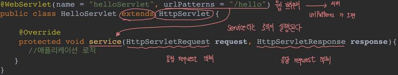 @ServletComponentScan : 자동으로 현재 패키지 포함 및 하위 패키지의 Servlet을 다 찾아서 자동으로 Servlet을 Servlet 컨테이너에 등록해서 실행할 수 있도록 도와준다@WebServlet(name, urlPatterns) : 서블릿 애노테이션, name : 서블릿 이름, urlPatterns : URL 매핑protected void service(HttpServletRequest request, Http ServletResponse response)