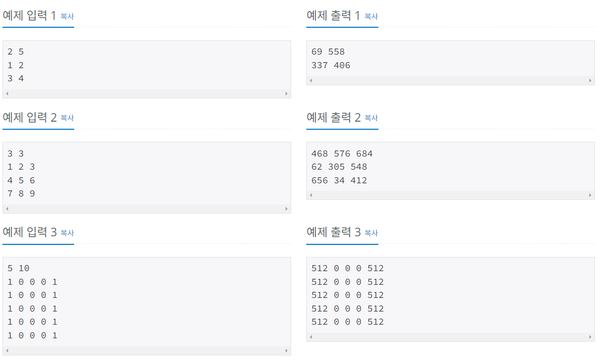 기계학습을 배우면서 행렬을 다룰 일이 많았는데 백준에서 행렬을 푸는건 처음이었던 것 같았다. 행렬에도 다양한 연산이 있고 해당 연산을 줄여주는 행렬과 관련된 알고리즘이 있다. 이에 더 많이 공부해야겠다고 생각한다.