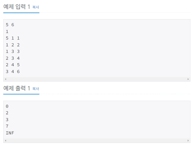 첫째 줄부터 V개의 줄에 걸쳐, i번째 줄에 i번 정점으로의 최단 경로의 경로값을 출력한다. 시작점 자신은 0으로 출력하고, 경로가 존재하지 않는 경우에는 INF를 출력하면 된다.