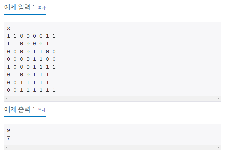 첫째 줄에는 전체 종이의 한 변의 길이 N이 주어져 있다. N은 2, 4, 8, 16, 32, 64, 128 중 하나이다. 색종이의 각 가로줄의 정사각형칸들의 색이 윗줄부터 차례로 둘째 줄부터 마지막 줄까지 주어진다. 하얀색으로 칠해진 칸은 0, 파란색으로 칠해진 칸은 1로 주어지며, 각 숫자 사이에는 빈칸이 하나씩 있다.