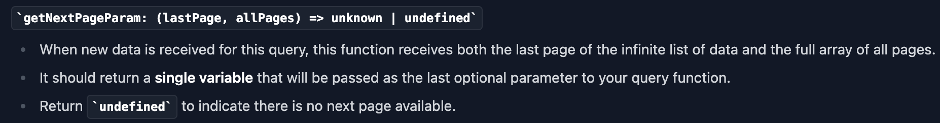 getNextPageParam 데이터 리스트의 마지막 페이지를 받아올 수 있다. 그리고 무조건 single variable을 반환해야 한다.