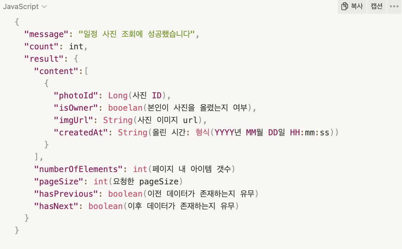 백엔드 팀원이 작성한 API 명세서는 다음과 같다. 마지막 데이터의 photoId를 보내면 그 다음 데이터부터 다시 size만큼의 데이터를 보내주고 만약 photoId가 null값일 경우 처음 데이터부터 보내준다.