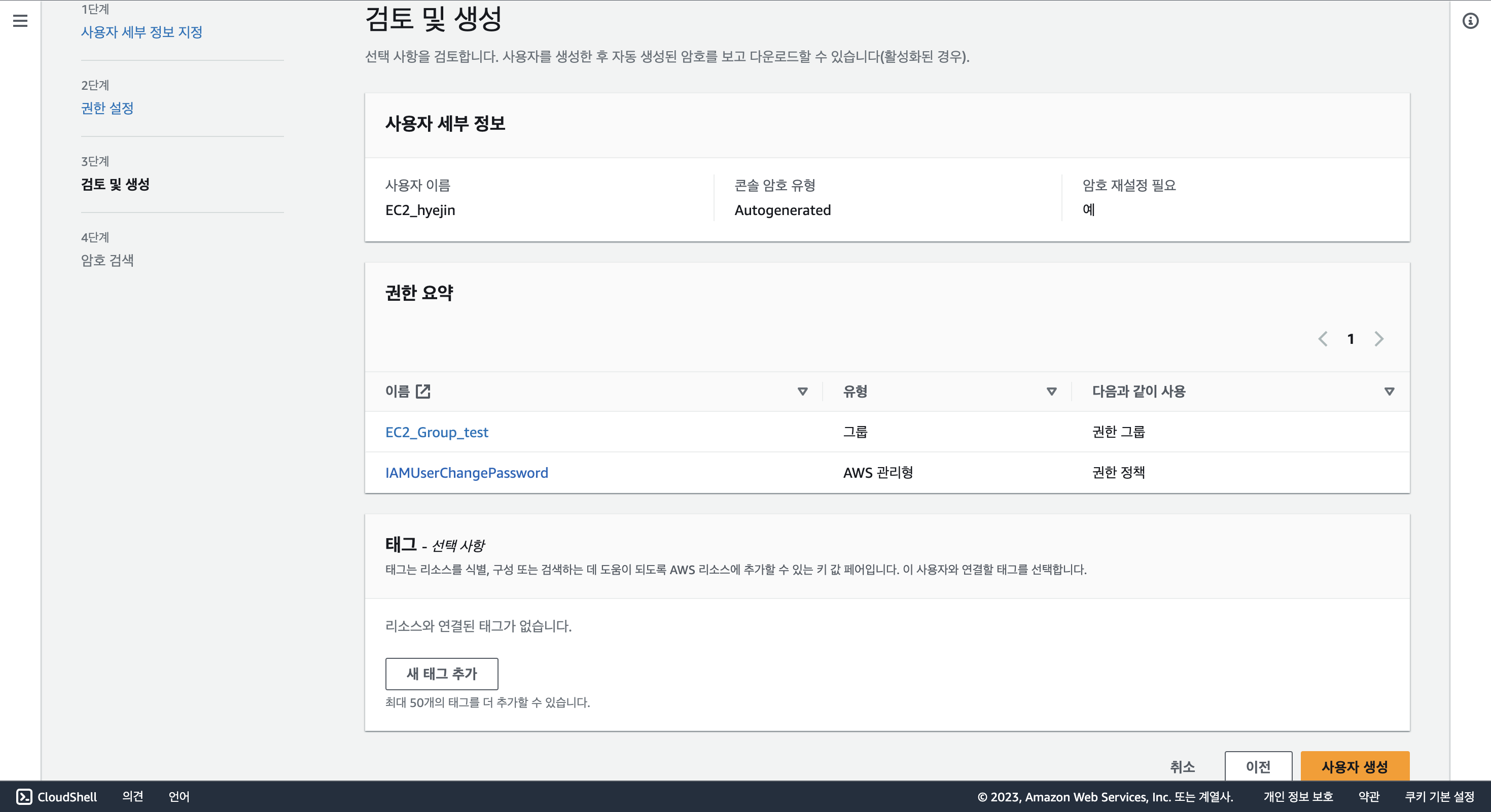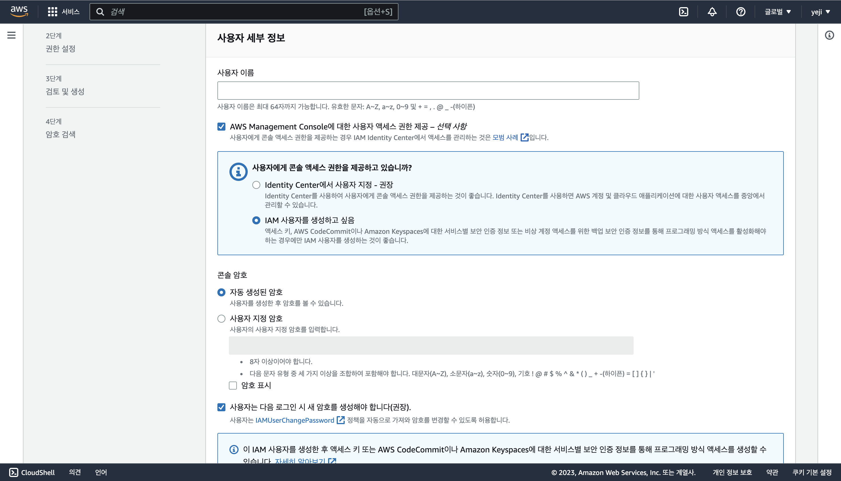 현재 보고 있는 화면처럼 웹페이지를 통해 AWS에 접속할 수 있게 하는 권한을 제공하는 것이다. 지금 만들고 있는 IAM 계정은 추후에도 내가 이용할 것이기 때문에 편의상 나는 체크를 하고 진행했다.