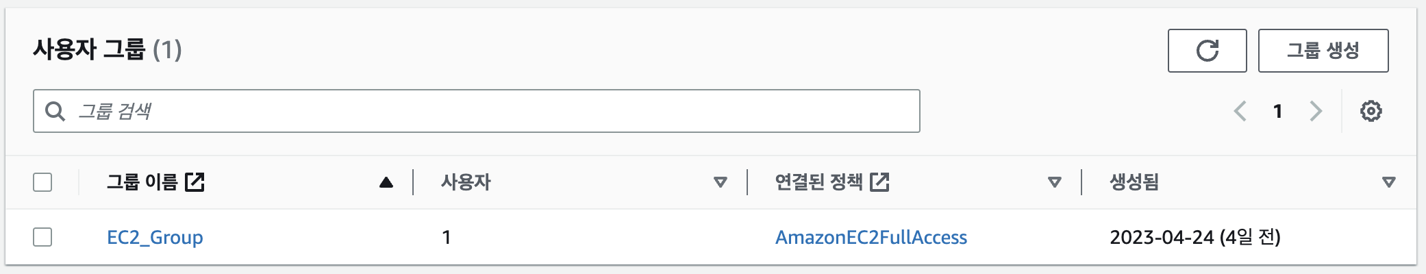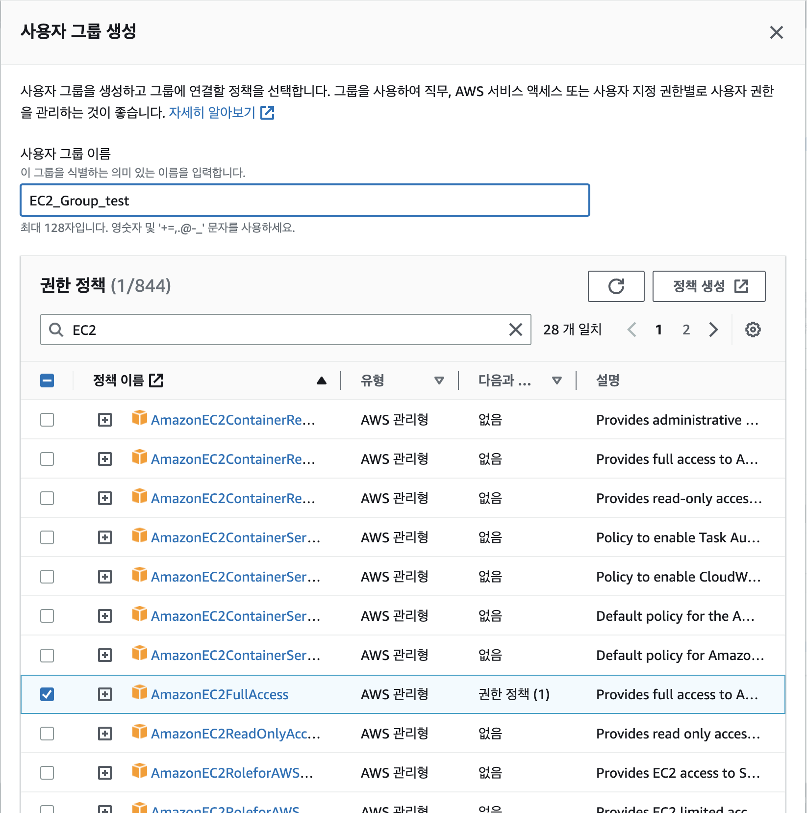 그런데 이렇게 된다면 IAM 계정을 따로 생성하는 의미가 없으니, EC2의 권한만을 부여하는 그룹을 만들어보도록 하겠다.