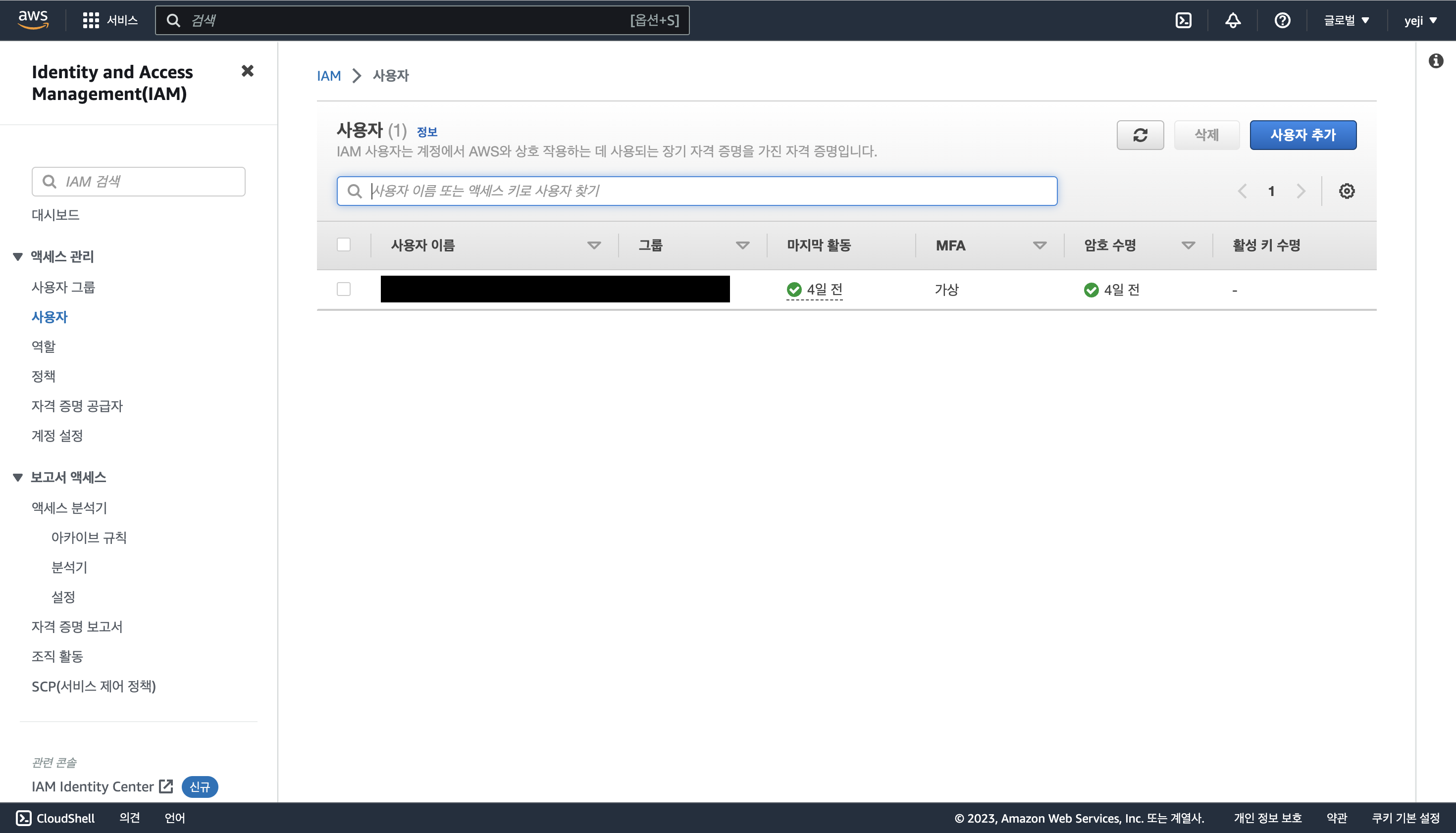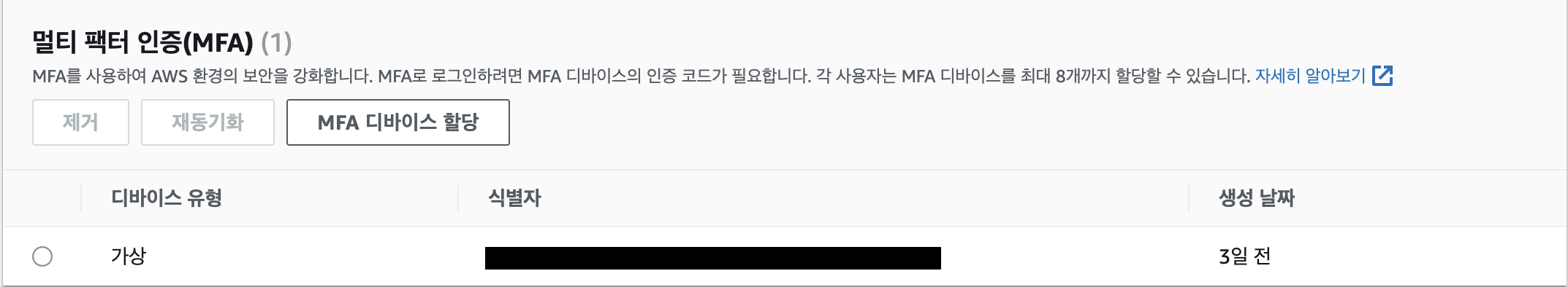 Google Authenticator에 들어가 QR 코드 표시를 누르면 나오는 QR 코드를 인식한다.앱에 뜬 MFA 코드를 두 번 입력해주고 화면에는 잘려서 나오지 않았지만 생성 버튼을 클릭하면 MFA 등록 완료다. 앞으로 이 계정을 사용할 때는 MFA 인증을 걸쳐야 한다.