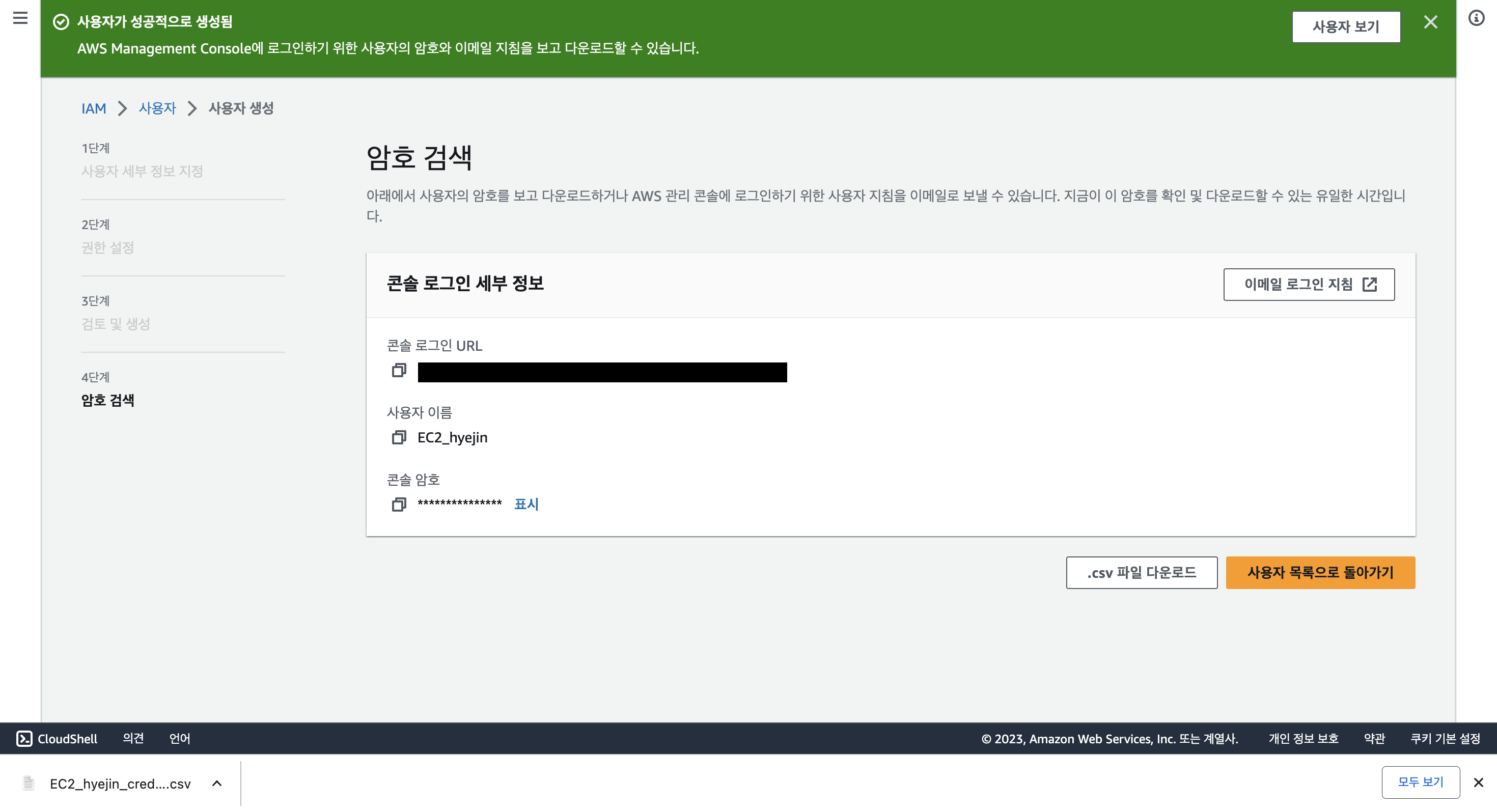 암호와 콘솔 로그인 URL이 나타난다.첫 로그인 시 이 암호를 입력해 접속을 하고 비밀번호를 변경할 수 있으므로 해당 암호가 든 파일을 잘 보관해야 한다.