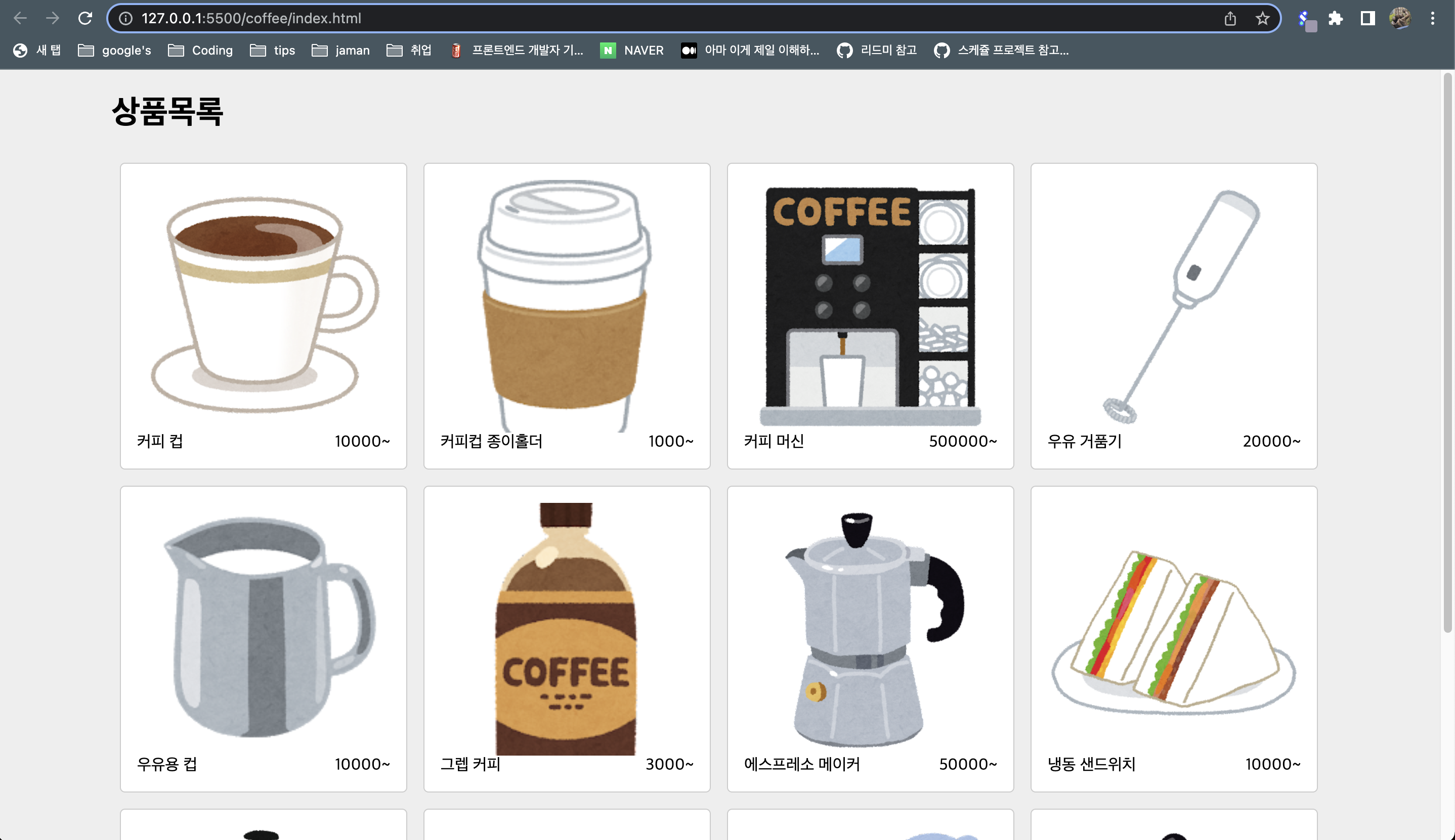 // 원본 html <main class="App"> <div class="ProductListPage"> <h1>상품목록</h1> <ul > <li class="Product"> <img src="imageUrl"> <div class="Product__info"> <div>name</div> <div>price~</div> </div> </li> ... </ul> </div> </main>