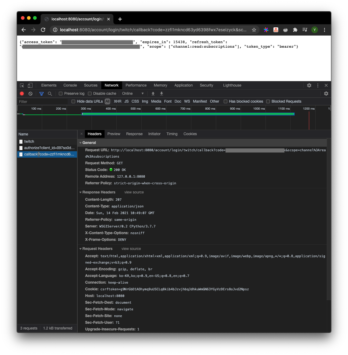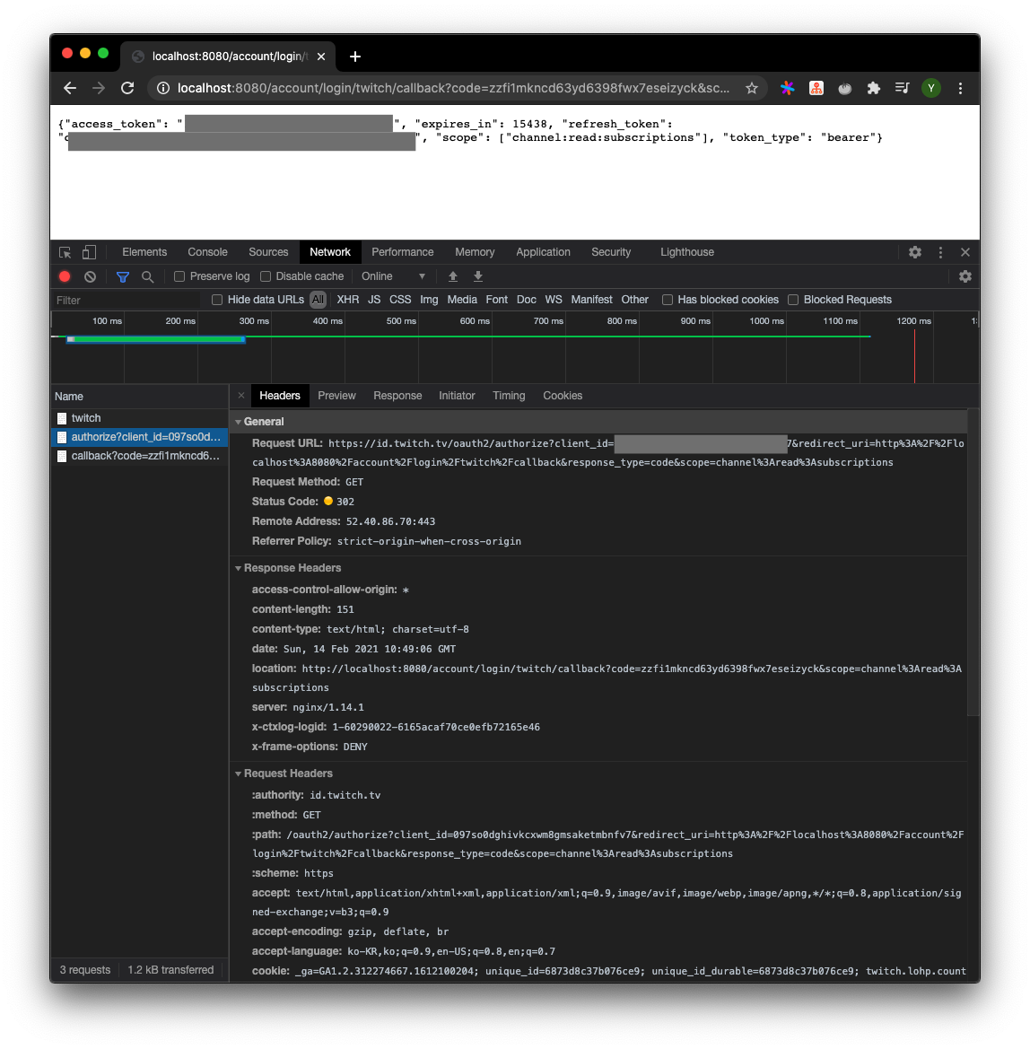 뭐 쓸데없이 어설프게 가렸지만 GET http://localhost:8080/account/login/twitch request의 response가 302, 302, 200이라는 것만 이해하고 넘어가자.