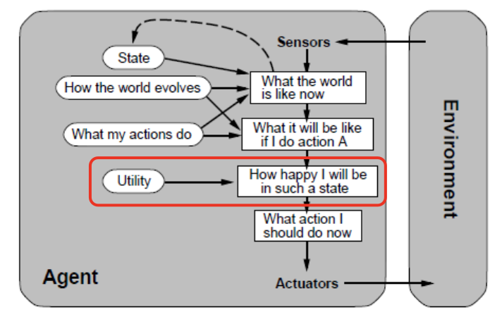 효용은 목표를 달성하는 데 얼마나 효과적인지를 나타낸다. 따라서 이 에이전트는 가능한 행동 중에서 가장 높은 효용을 가진 것을 선택한다.