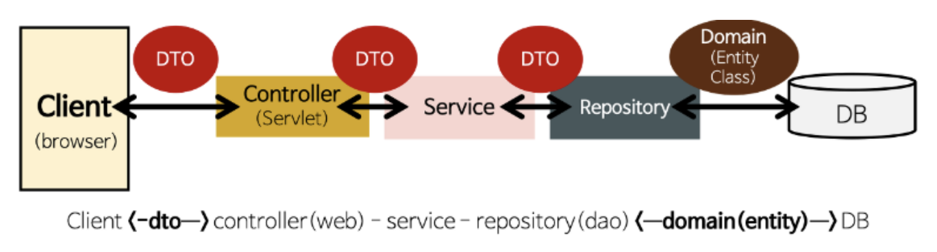 위 사진에 보이는 것처럼 스프링부트는 3가지 Layer가 존재하며 이들이 프로젝트의 구조를 담당한다.