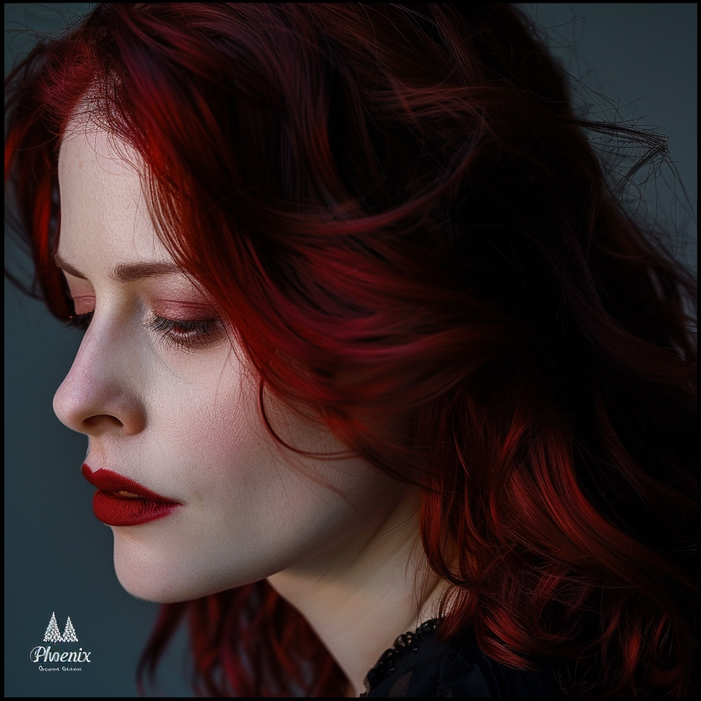 A cinematic photo album cover featuring a mature woman, resembling a queen, seated on a gold throne, holding a powerful and authoritative sword, inspired by Charlize Theron and Eva Green. With her long, dark auburn hair and crimson highlights, she embodies resilience and inner fire. Dramatic studio lighting and partially darkened composition evoke strength, determination, and rebirth. A mature, intense close-up composition captures restrained intensity and authority. The decorative elements of gold metal linear lines, editorial style, and realistic details are highlighted. The English title "Phoenix Queen" is included. --ar 1:1 --v 6.0 --raw --sref