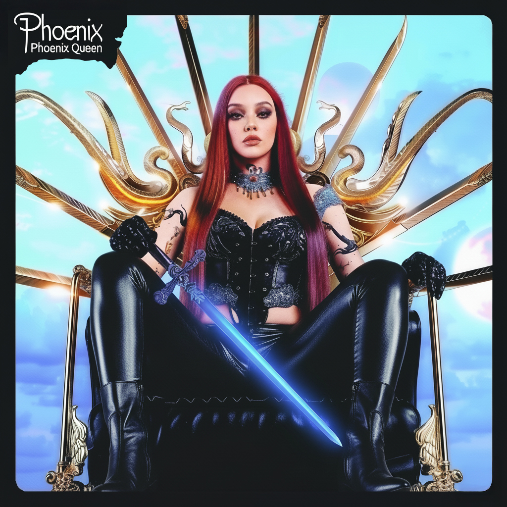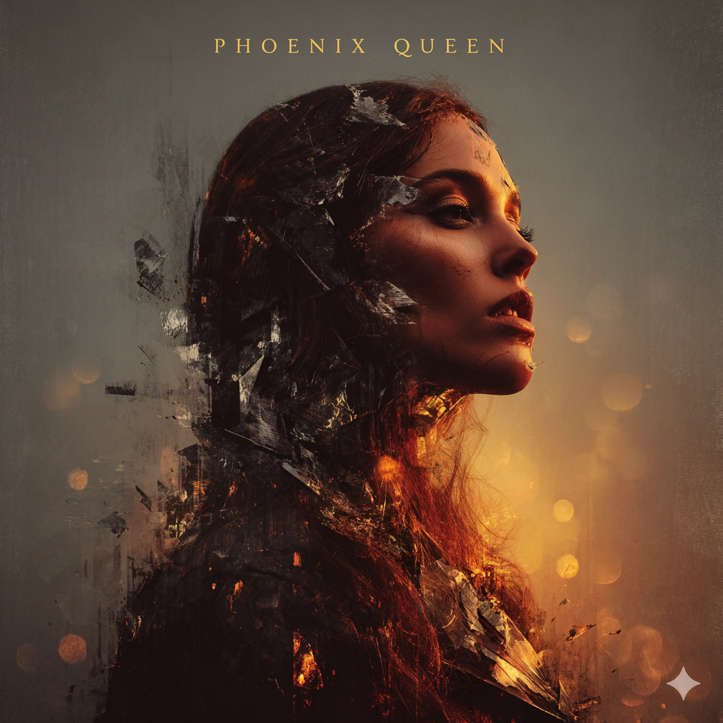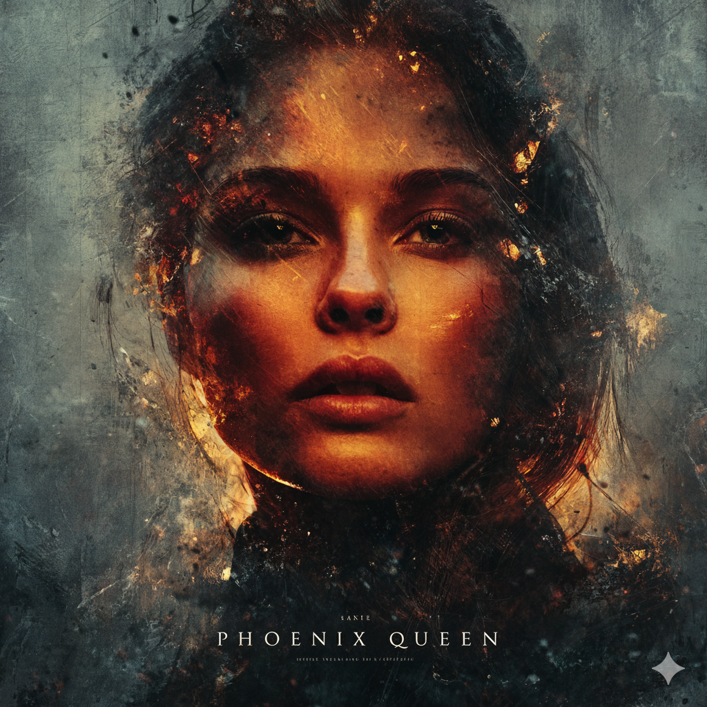 A cinematic photo album cover featuring a mature woman, resembling a queen, seated on a gold throne, holding a powerful and authoritative sword, inspired by Charlize Theron and Eva Green. With her long, dark auburn hair and crimson highlights, she embodies resilience and inner fire. Dramatic studio lighting and partially darkened composition evoke strength, determination, and rebirth. A mature, intense close-up composition captures restrained intensity and authority. The decorative elements of gold metal linear lines, editorial style, and realistic details are highlighted. The English title "Phoenix Queen" is included. --ar 1:1 --v 6.0 --raw --sref https://s.mj.run/y67dyvs8_m4 --sw 1000