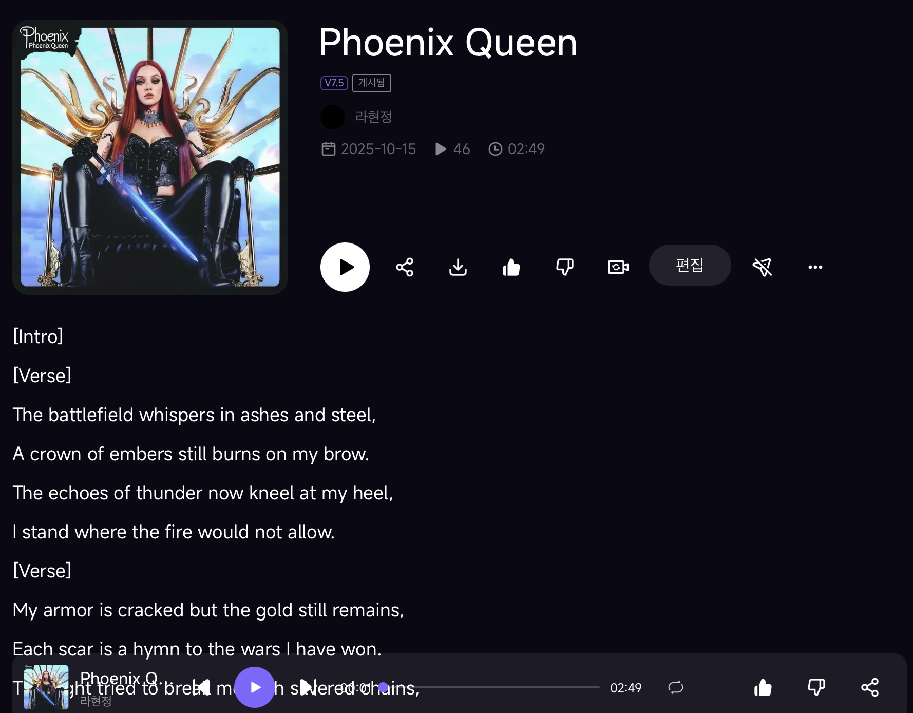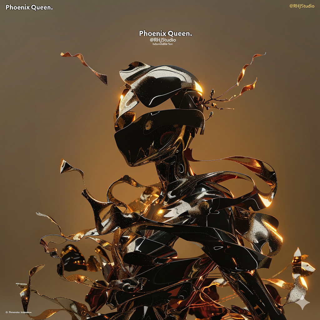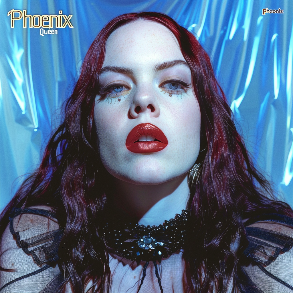 A cinematic photo album cover featuring a mature woman, resembling a queen, seated on a gold throne, holding a powerful and authoritative sword, inspired by Charlize Theron and Eva Green. With her long, dark auburn hair and crimson highlights, she embodies resilience and inner fire. Dramatic studio lighting and partially darkened composition evoke strength, determination, and rebirth. A mature, intense close-up composition captures restrained intensity and authority. The decorative elements of gold metal linear lines, editorial style, and realistic details are highlighted. The English title "Phoenix Queen" is included. --ar 1:1 --v 6.0 --raw --sref https://s.mj.run/y67dyvs8_m4 --sw 1000