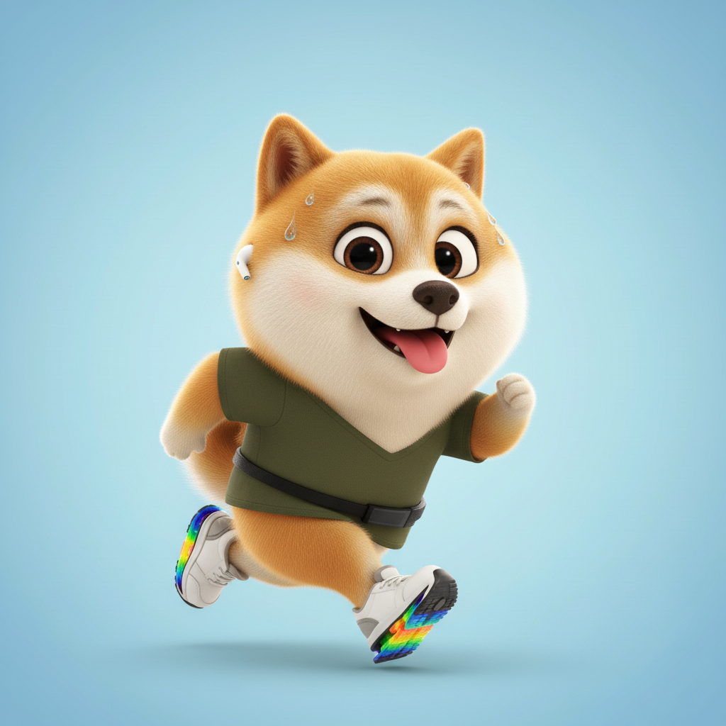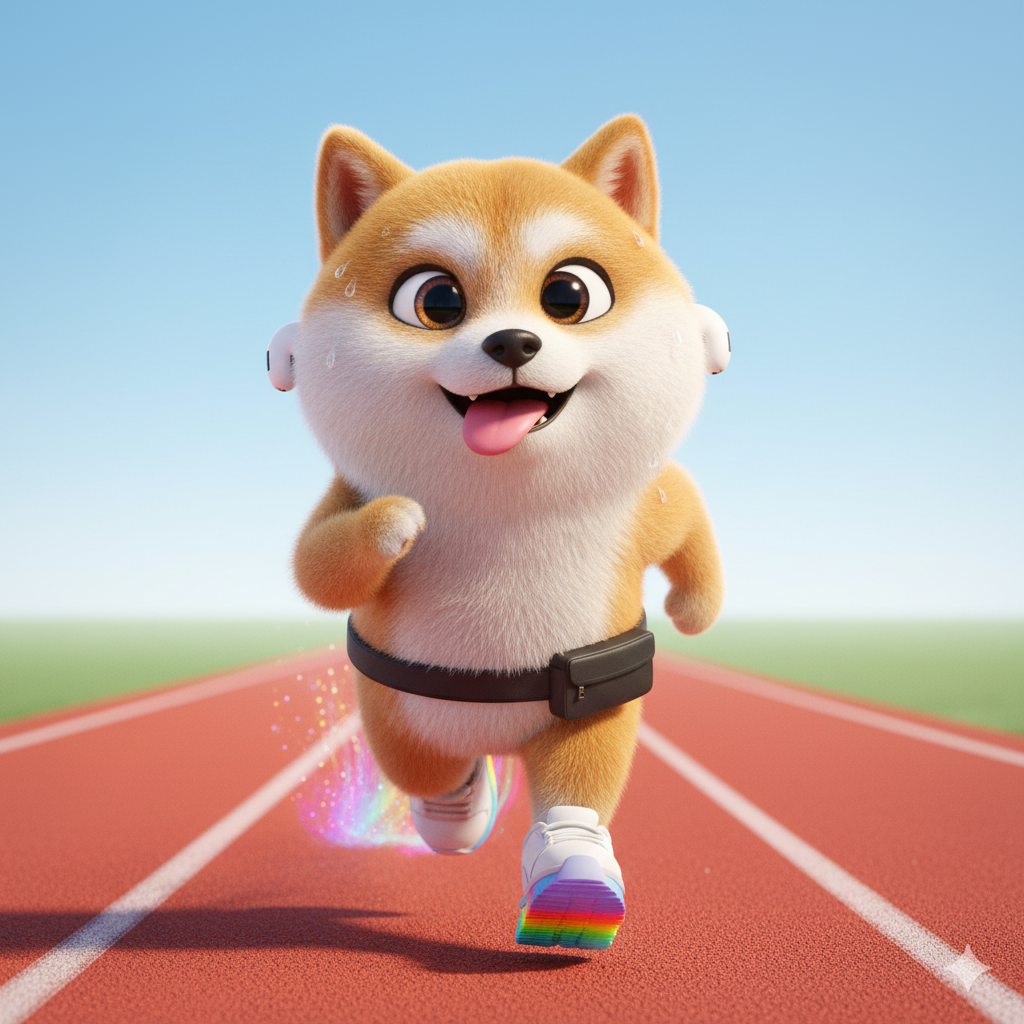 A cute and adorable Shiba Inu with big, round eyes reminiscent of a character from the cartoon "The Secret Life of Pets" is shown smiling and showing off his pride in a sweaty running pose, tongue out, wearing white running shoes with fluorescent rainbow-colored cushions, a running belt, and AirPods. The fluffy fur texture, pastel sky blue background, and Illumination Studio style are realized with surreal precision.