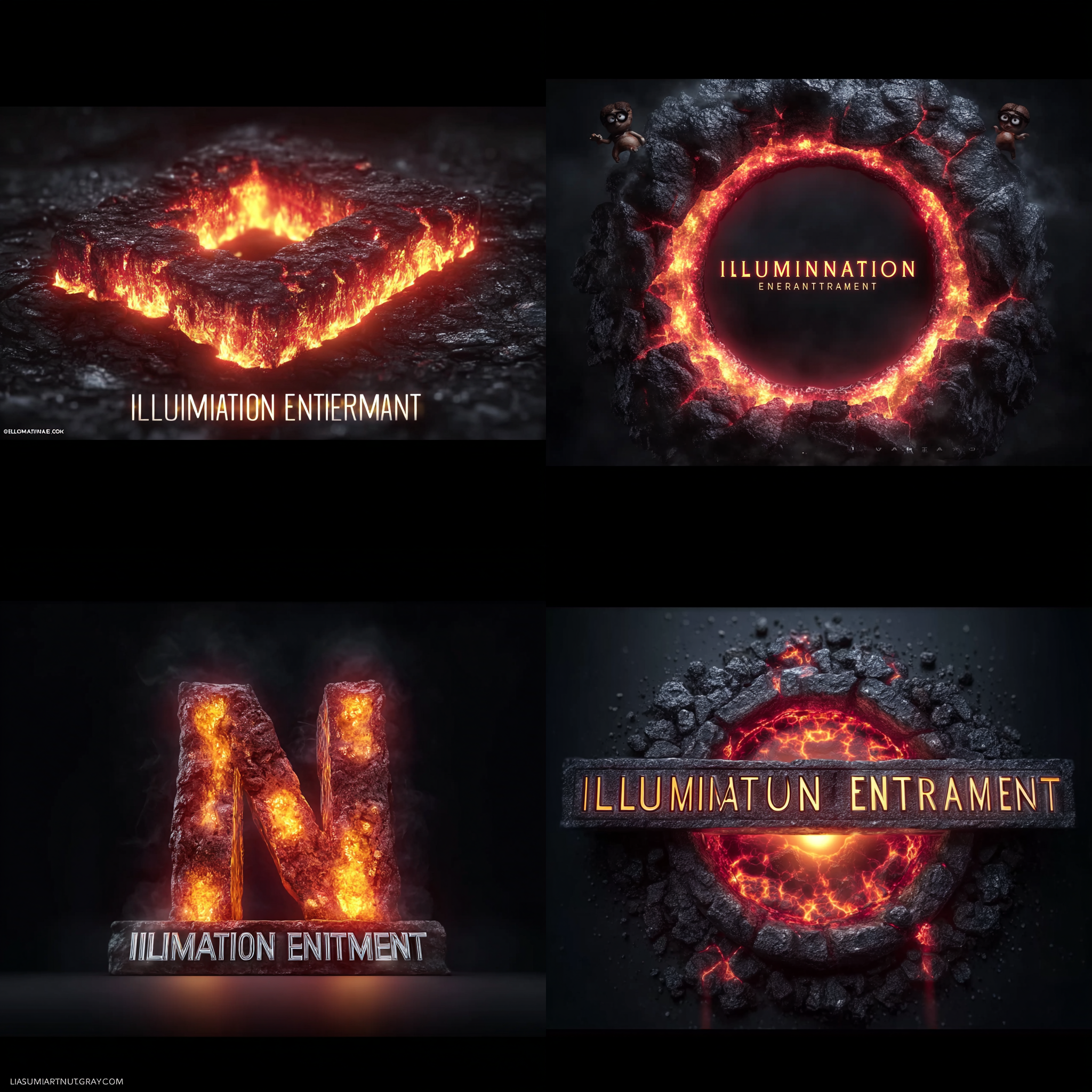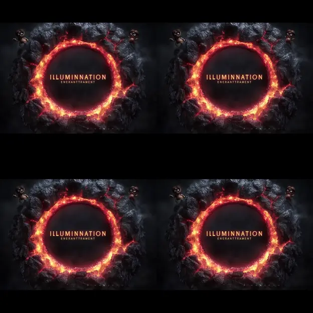 A "ILLUMINATION ENTERTAINMENT" LOGO in Hyper realistic burning textures of glowing boiling lava