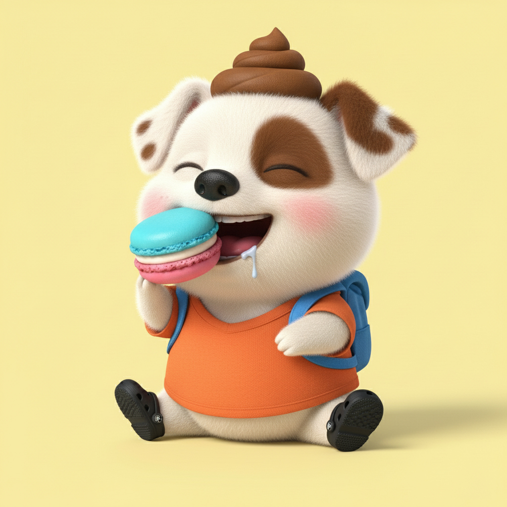 A cute and adorable spotted puppy with a tiny, pointy nose and charming dimples reminiscent of a character from the cartoon "The Secret Life of Pets," wearing a poop hat, an orange U-neck short-sleeved T-shirt, black Crocs, and a backpack. He's eating a macaron, his eyes closed and smiling, his mouth wide open, and his mouth drooling. The fluffy fur, pastel yellow background, and Illumination Studio's style are all rendered with surreal precision.