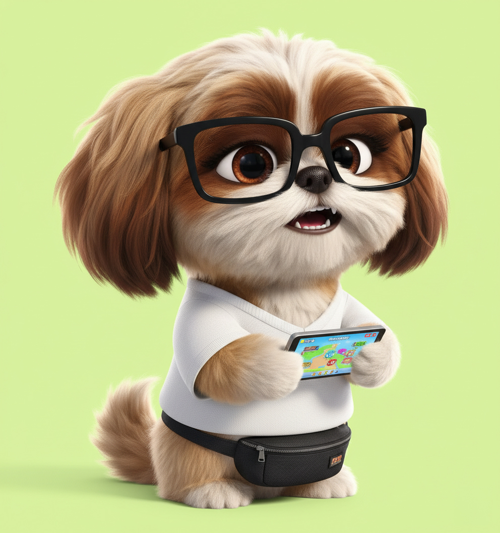 Reminiscent of a character from the cartoon "The Secret Life of Pets," this adorable Shih Tzu has downturned eyebrows, charmingly bulging eyes, and upturned eyes with long, pointed tails. He's depicted smiling brightly, revealing sharp fangs, while playing a mobile game. He wears black rectangular horn-rimmed glasses, a white V-neck collared short-sleeved T-shirt, and a black hip sack. The fluffy fur texture, pastel lime green background, and Illumination Studio's style are rendered with surreal precision.