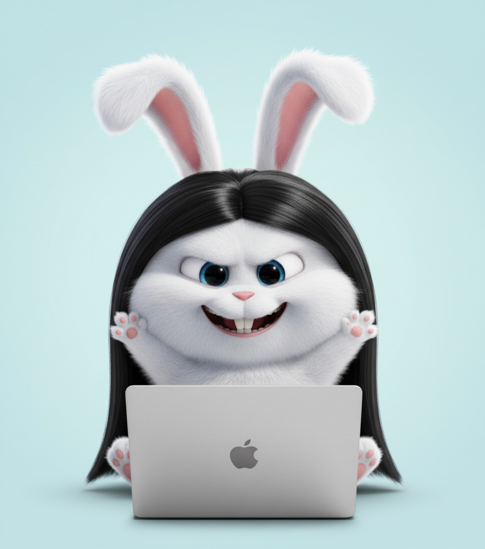 Snowball, a cute and adorable character from "The Secret Life of Pets," is wearing a black, straight wig with no bangs and a parted back, and is tapping away at her MacBook, expressing her triumphant joy. A pastel sky blue background.