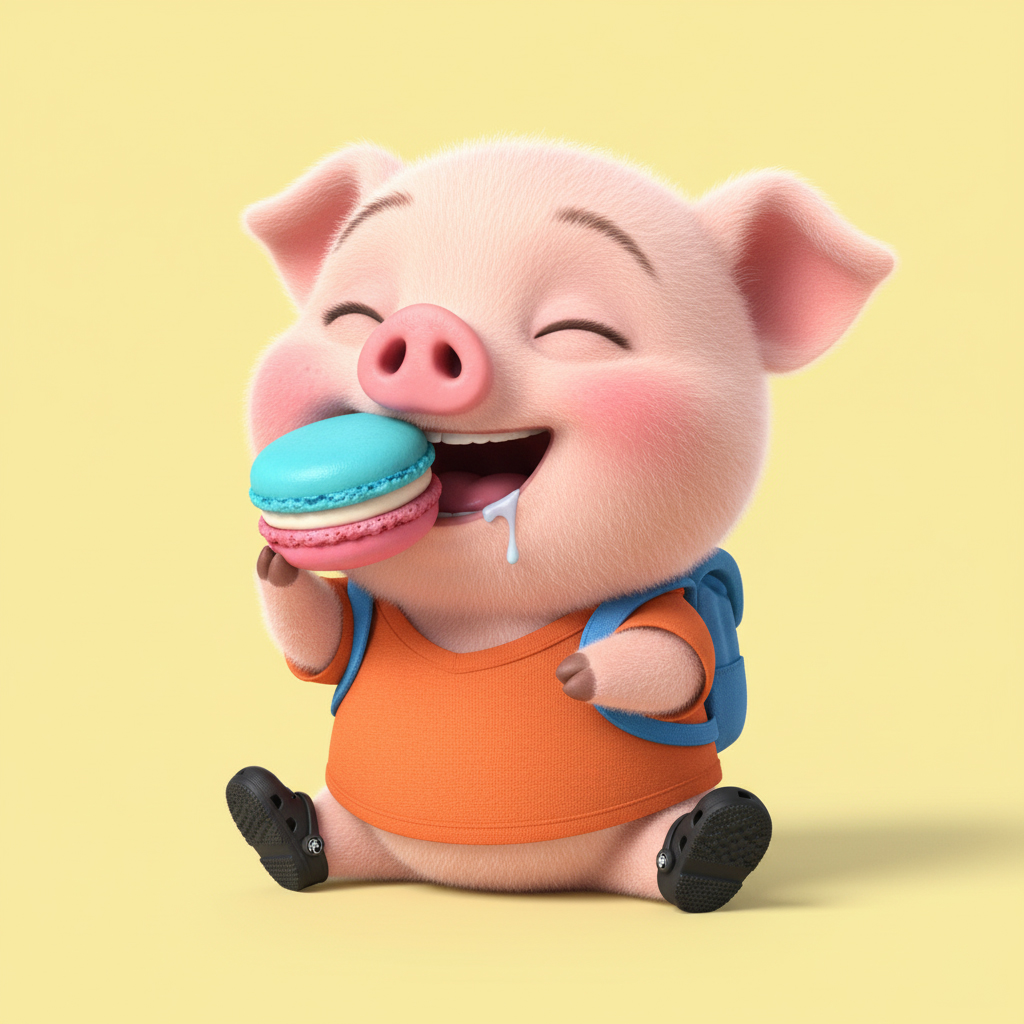 A cute and adorable baby pig with a tiny, pointed nose and charming dimples reminiscent of a character from the cartoon "The Secret Life of Pets" is wearing an orange U-neck short-sleeved T-shirt, black Crocs, and a backpack. She's eating a macaron, her eyes closed with a smile and her mouth wide with a drooling expression. The fluffy fur texture, pastel yellow background, and Illumination Studio style are all rendered with surreal precision.