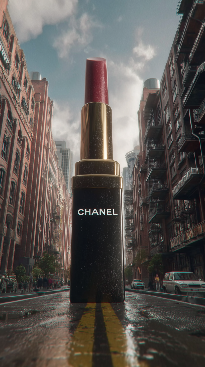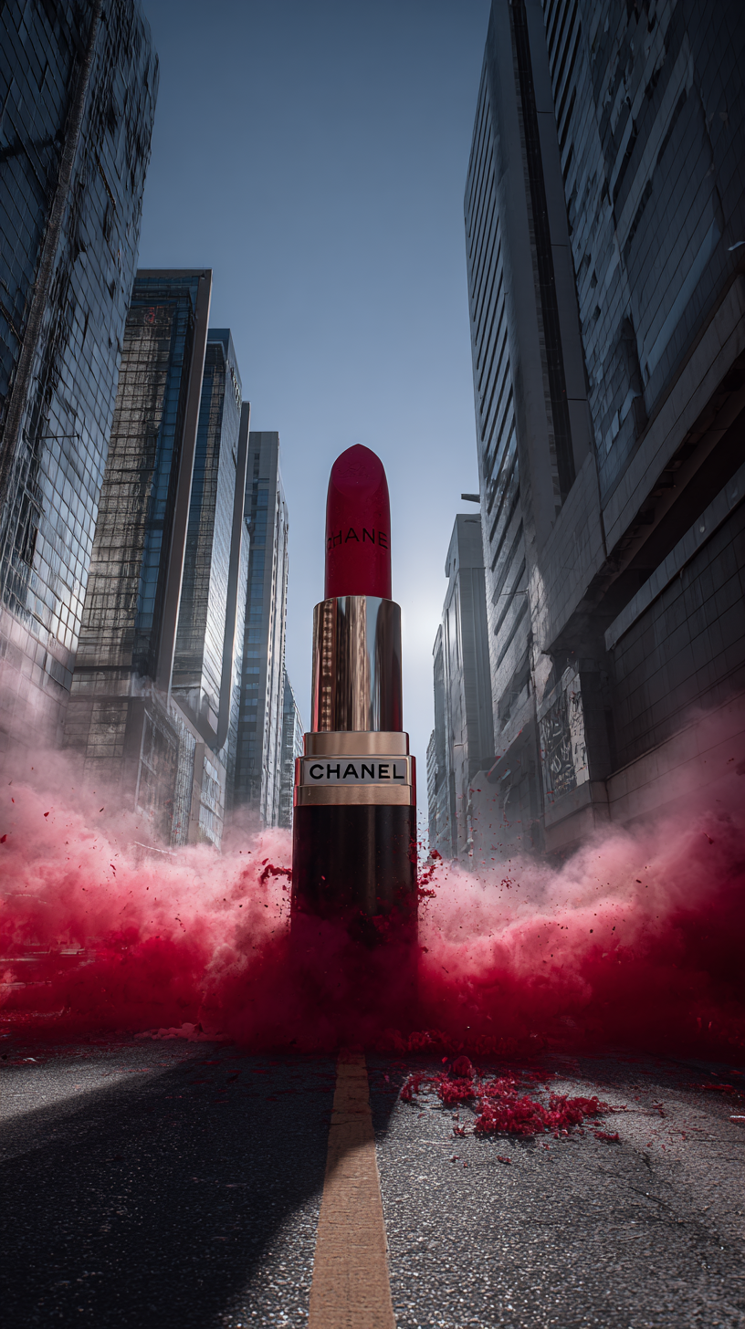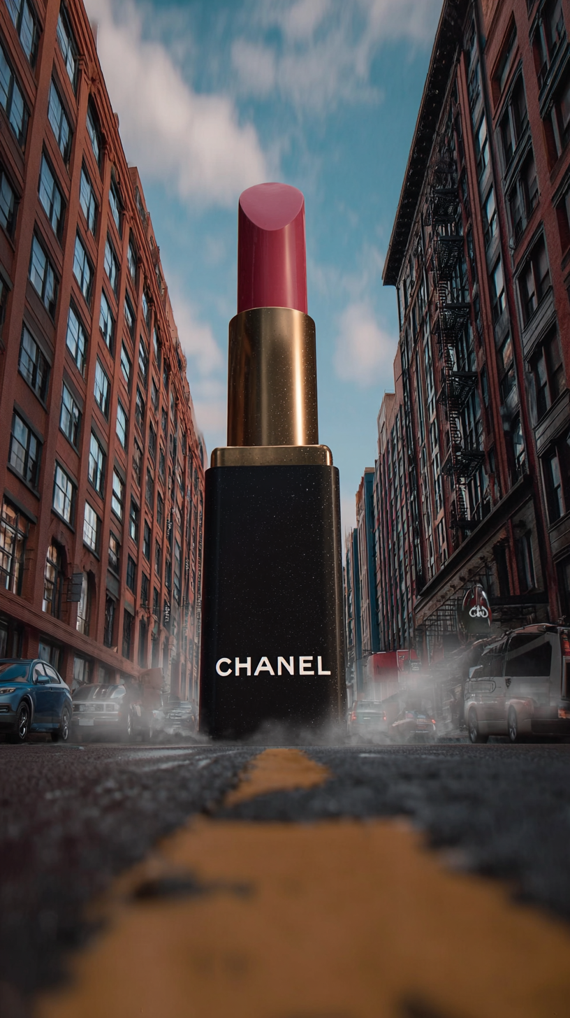 hyper reality Photographic, A giant " CHANEL " lipstick placed on the road between buildings, Low Angle view, made in VFX, Exterior, Dynamic, surreal, high detail --ar 9:16