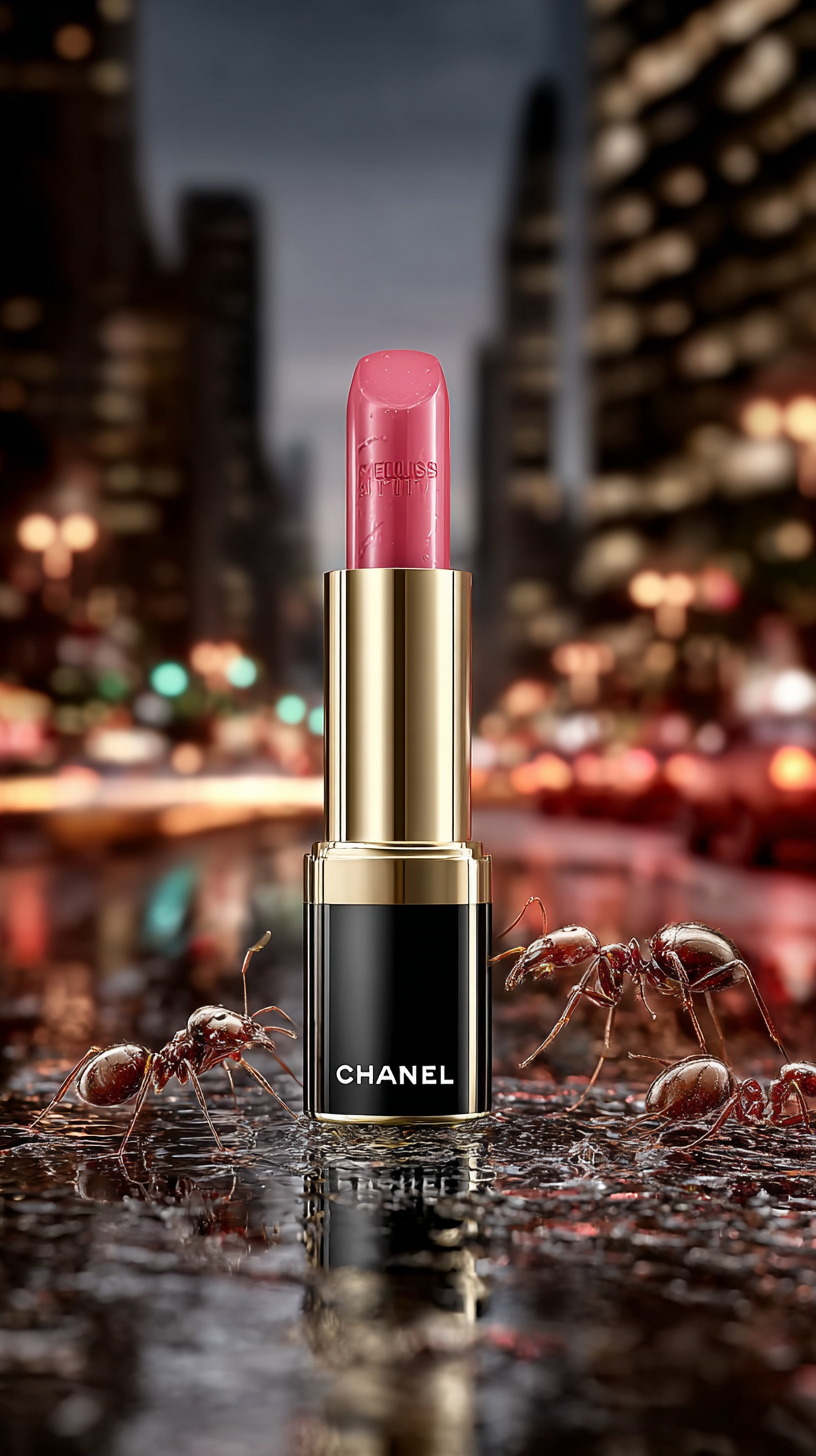 hyper reality Photographic, Micro mini "CHANEL" lipstick with ants on the road in the city center, High Angle view, made in VFX, Exterior, Dynamic, surreal, high detail --ar 9:16 --s 1000 --sref