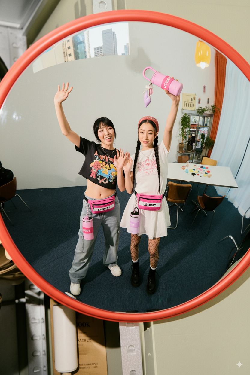 Two women in their early 20s stand before a convex mirror, their reflections in the mirror. They are both celebrating freely, with nothing in their hands. The surroundings, reflected in the mirror, are a downtown street. They are wearing hip, casual, and feminine clothing. A hot pink belt bag with a chain, complete with a horizontal stripe reading "LEGODT," hangs from their hips. The tumbler is pink. This is a promotional image for the tumbler. Wide angle, full body shot, high angle.