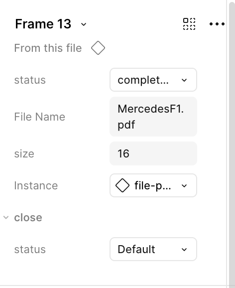 현재 상태, 파일 이름, 파일 사이즈, 파일 종류 아이콘, close 버튼 프로퍼티를 네스티드 인스턴트로 가져왔다 !