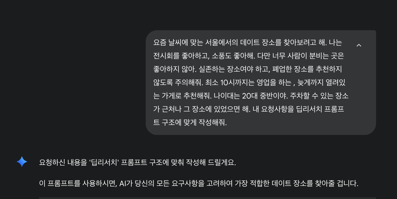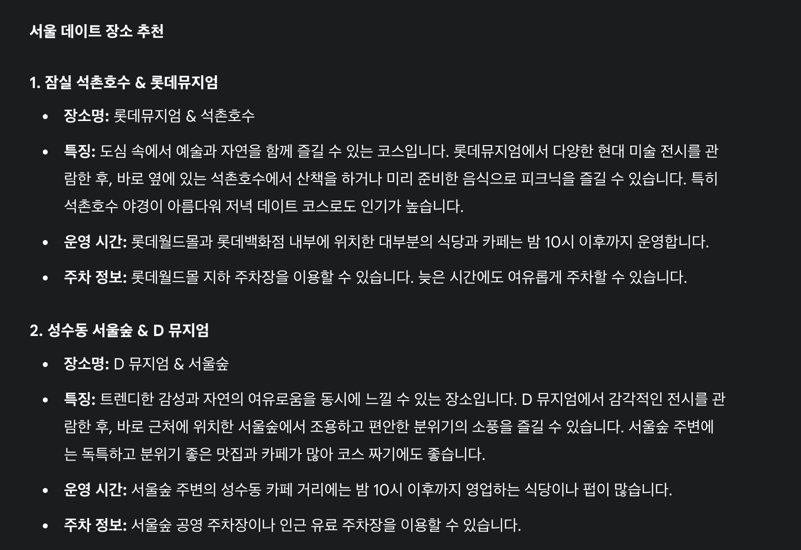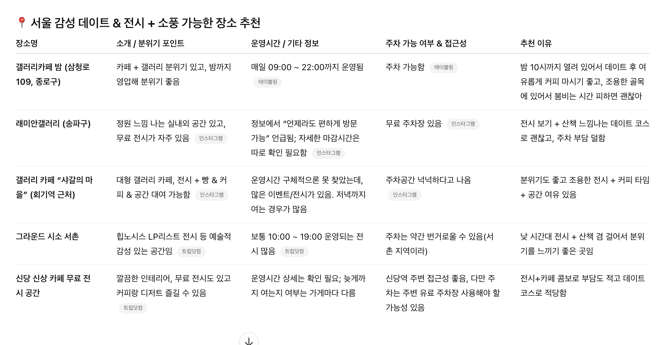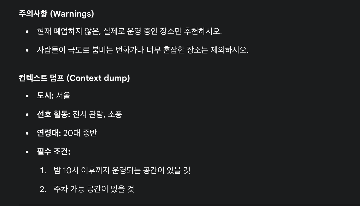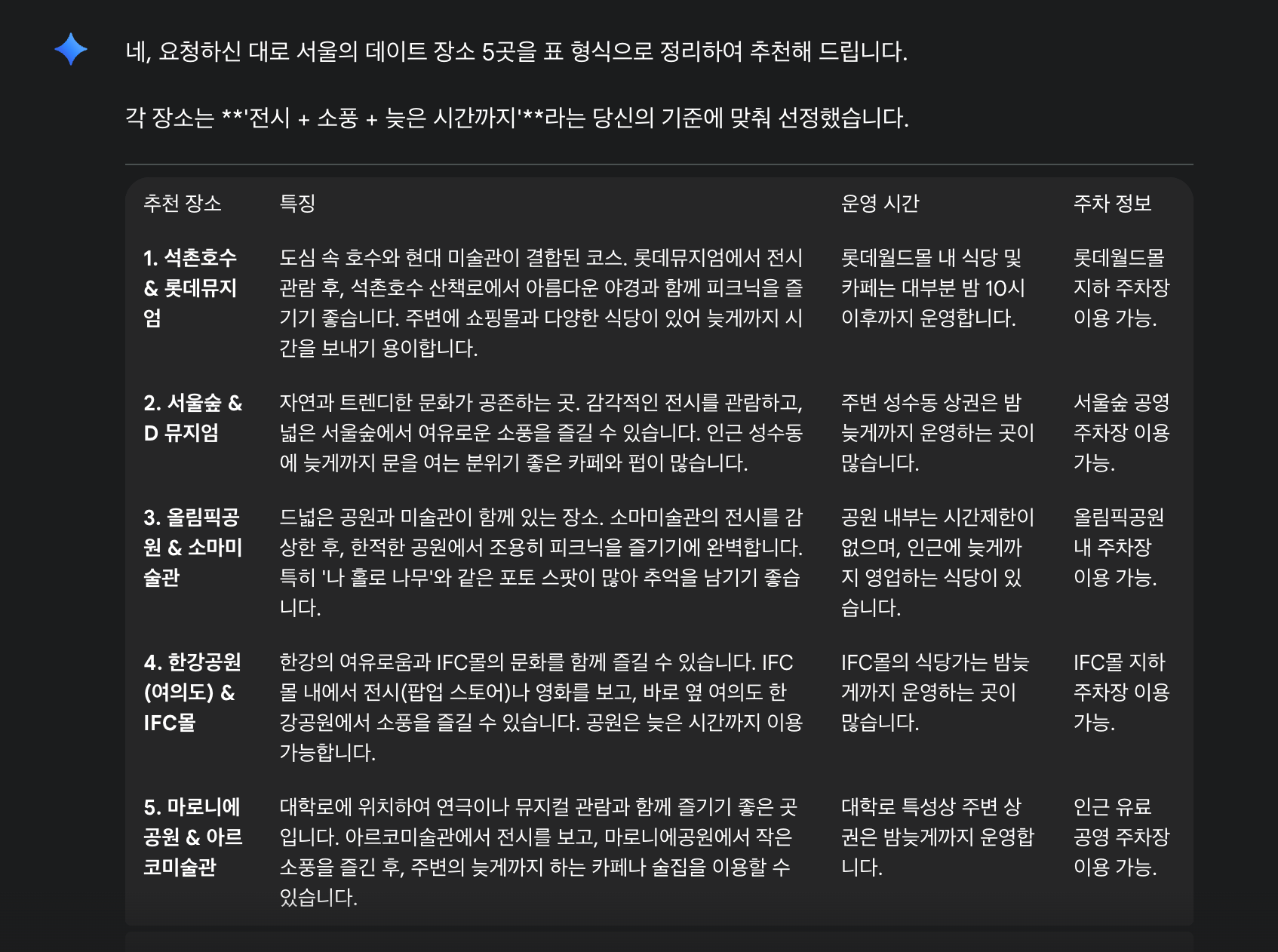 챗지피티는 ‘전시회’ 키워드에 집중해서 알려주었다. 운영시간은 필수조건이 아니라, 충분조건 정도로 생각하고 찾아주었다. 챗지피티가 처음 준 표 양식이 마음에 들었다. 제미나이는 ‘전시회+산책’을 모두 만족하는 데이트 코스를 추천해주었다. 제미나이 역시 운영시간을 자세하게 찾아주진 않았다. 제미나이는 정말 네이버 상위권의 장소만 추천한 결과 같아서, 개인적으로는 챗지피티의 결과물이 더 마음에 들었다.