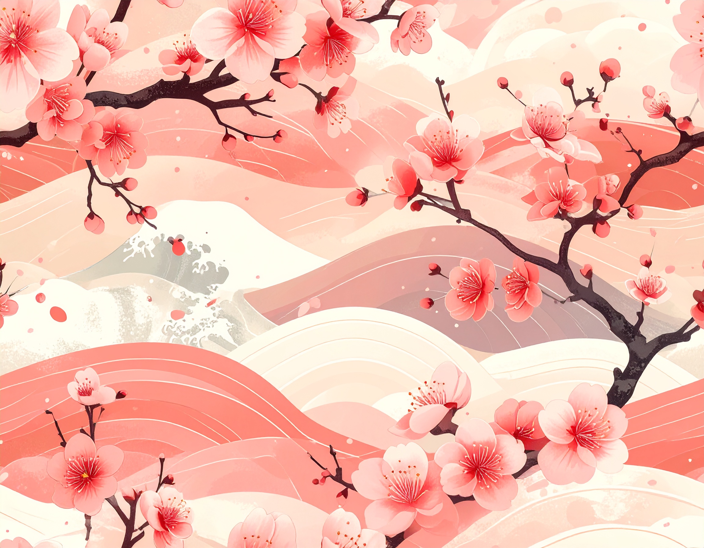 "Seamless pattern design inspired by springtime, featuring peach blossoms, soft waves, and Japanese-inspired minimal motifs. Use pastel pink, peach, and light beige tones. The mood should be gentle, cozy, and elegant."