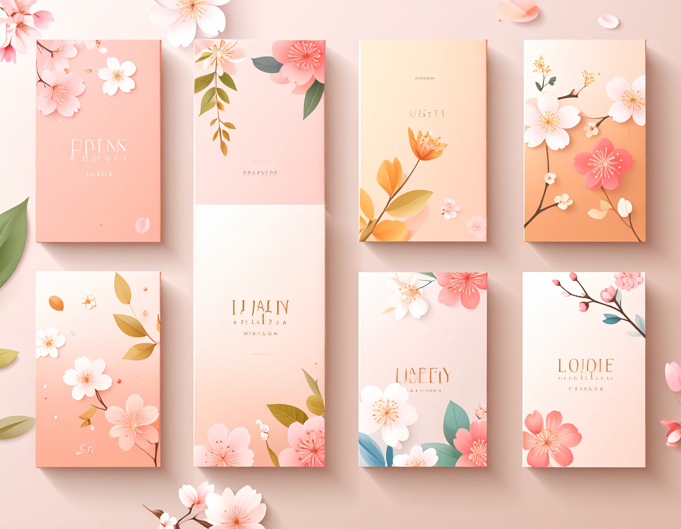 "Elegant packaging design for a lifestyle brand, using soft peach and pastel tones with a Japanese minimal aesthetic. Include delicate floral patterns and smooth gradients that evoke calmness and warmth. Clean typography with serif font, modern and sophisticated."