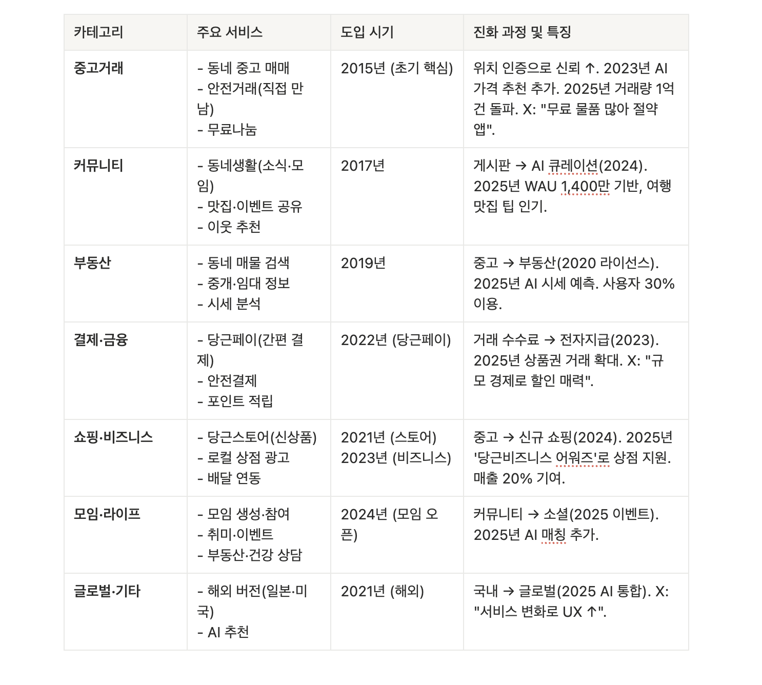서비스 진화의 핵심은 하이퍼로컬 전략: 지역 데이터 활용으로 개인화. 2025년 "앱인 앱" 플랫폼으로 개발자 생태계 구축 중. 그러나 X에서 "거래 사기"처럼 보안 강화 과제 지적.