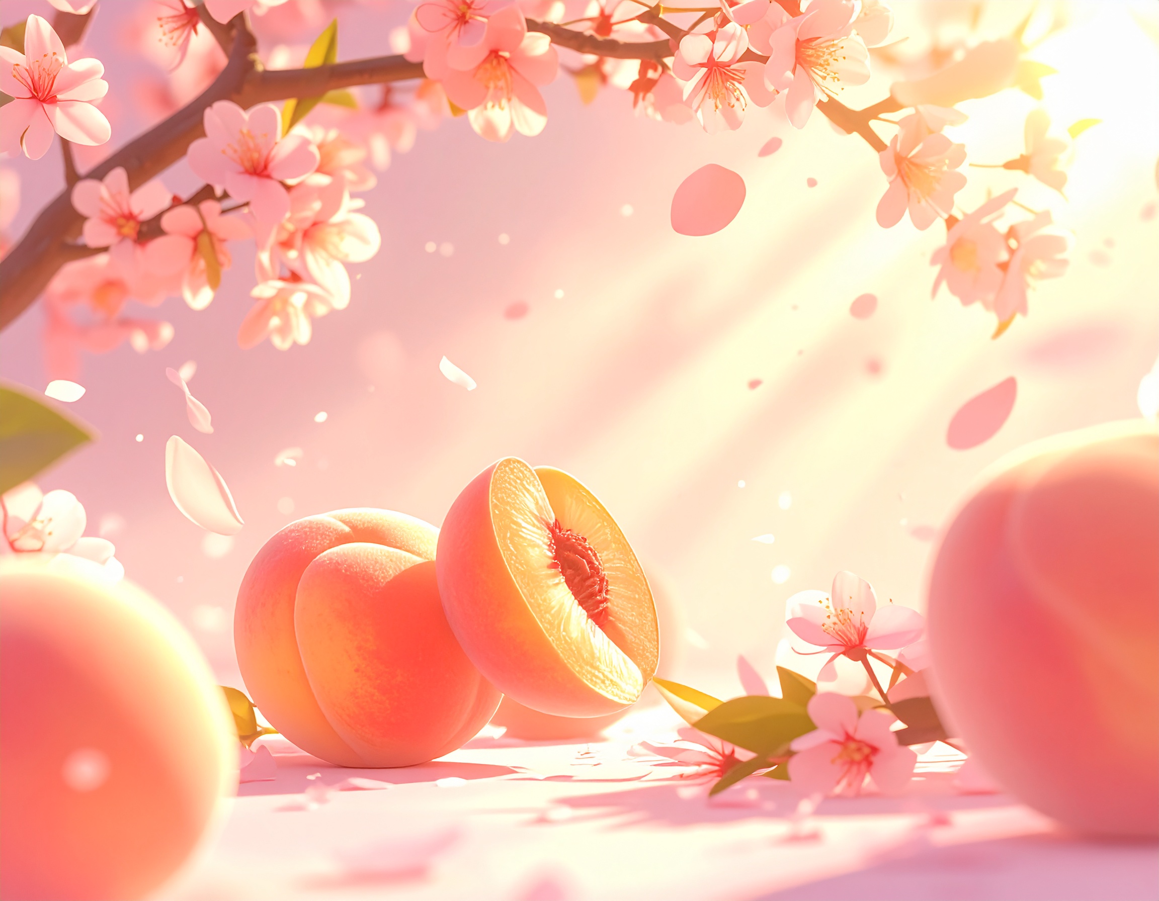"A branding poster with a calm spring atmosphere, showcasing a peach-inspired lifestyle brand. Soft sunlight, gentle peach blossom petals floating, and minimal Japanese-style typography. Warm, pastel color palette with a poetic and dreamy mood."