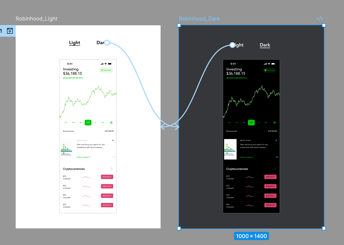 버튼 실습을 바탕으로 로빈훗 어플을 클론하여 Light/Dark 모드를 전환해보았다.
