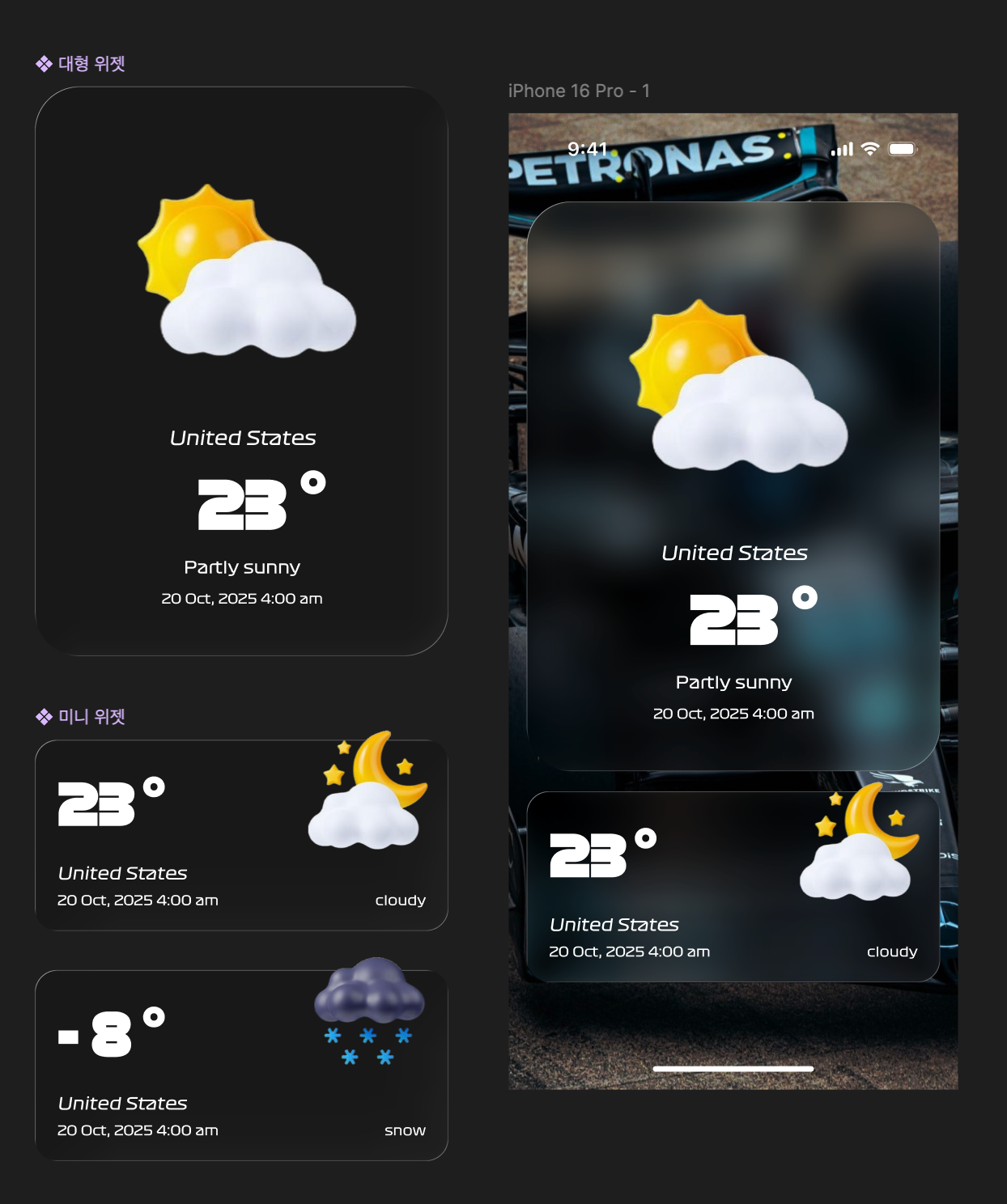 : 대형위젯과 미니위젯을 디자인해주었다. 스타일은 역시나 내가 좋아하는 글래스모피즘, 레이아웃이나 구성요소는 레퍼런스를 참고하여 제작해주었다.
