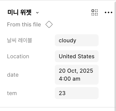 : 날씨 아이콘 및 레이블, 위치(국가 및 도시명), 기온, 현재 시각으로 정의하고