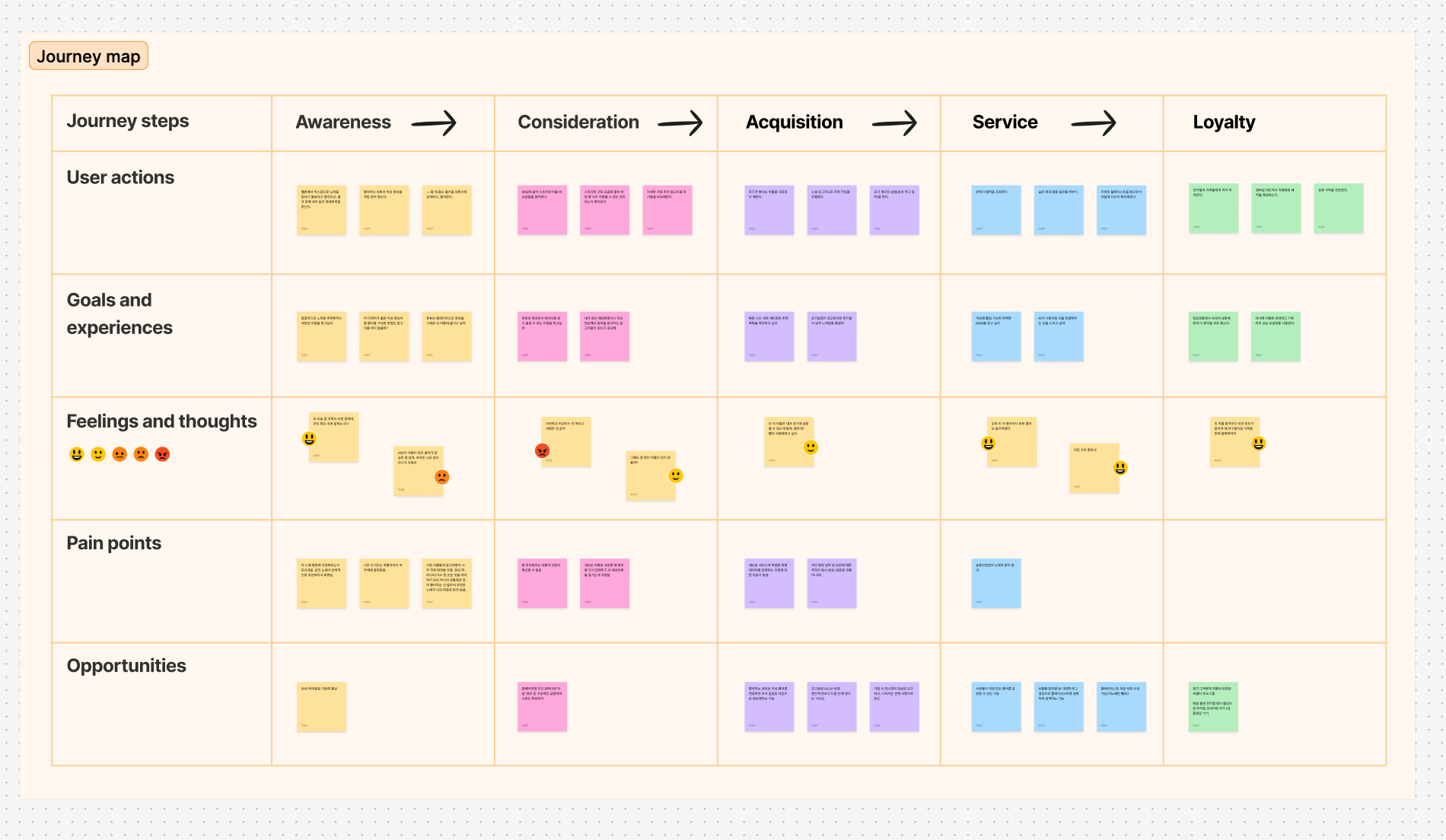 사용자가 목표를 달성하기 위해 거치는 단계 + 감정 변화 + 행동 패턴을 시각화한 지도.