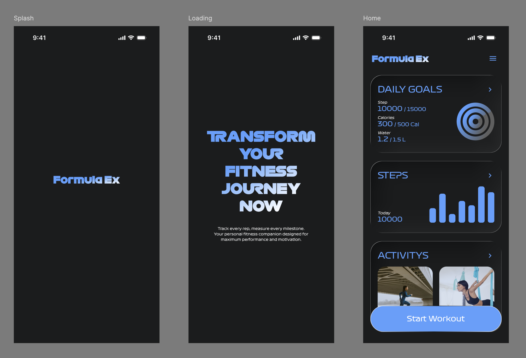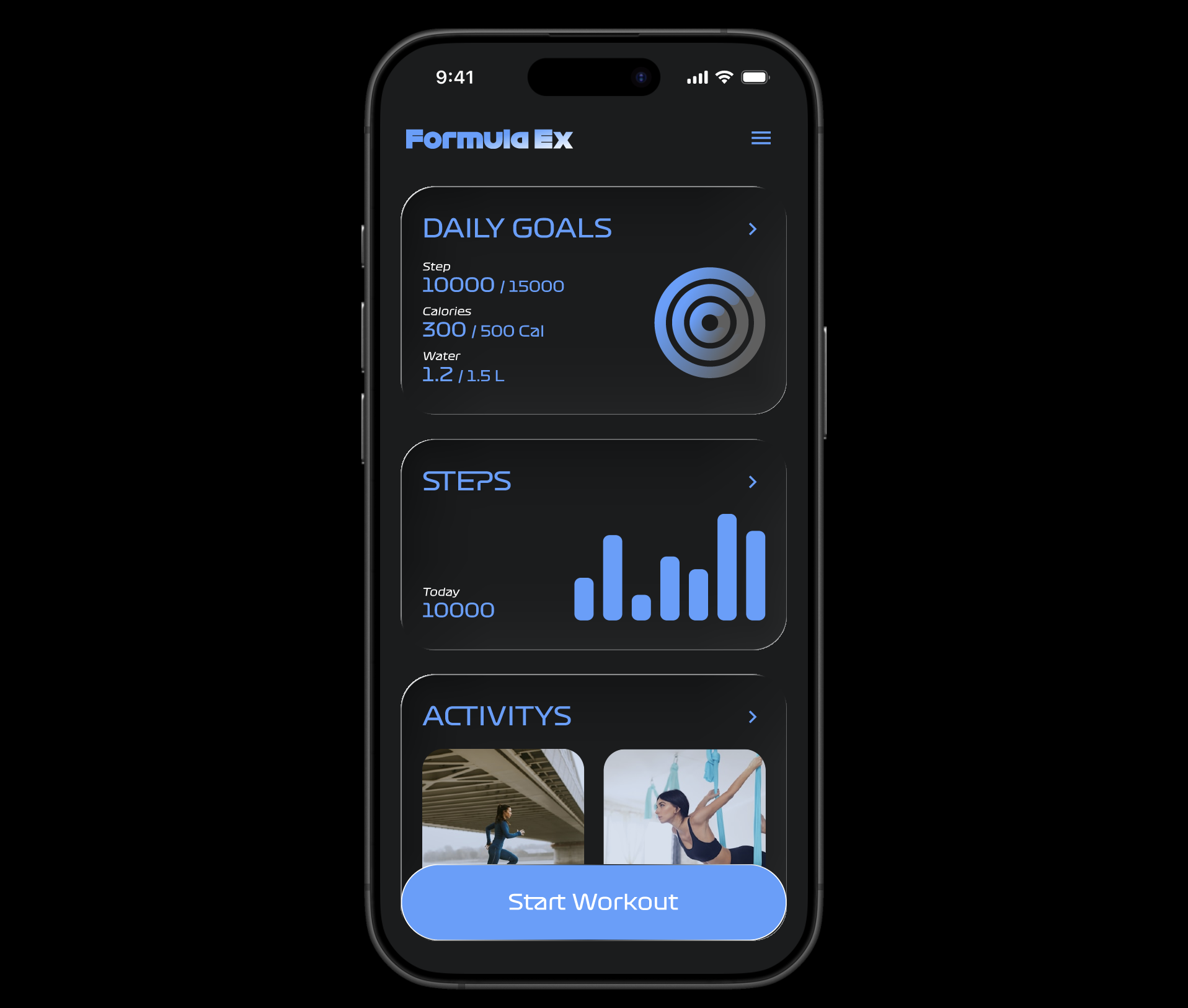 홈 화면의 구성요소는 주요 성과 대쉬보드(데일리), 주간 목표(걸음수) 및 진행상황, 개인 추천 활동, 즉각적인 운동 시작 버튼이다.