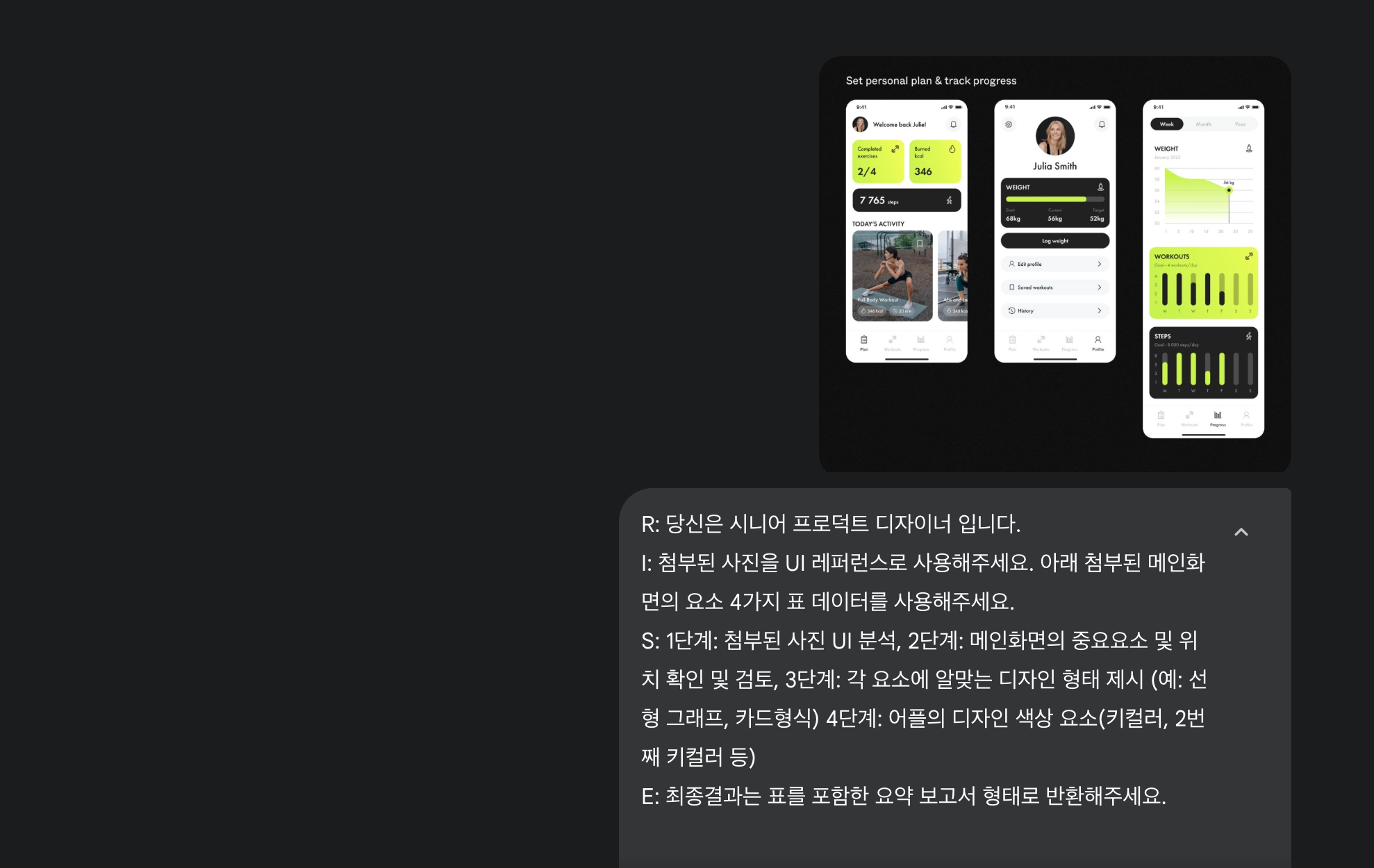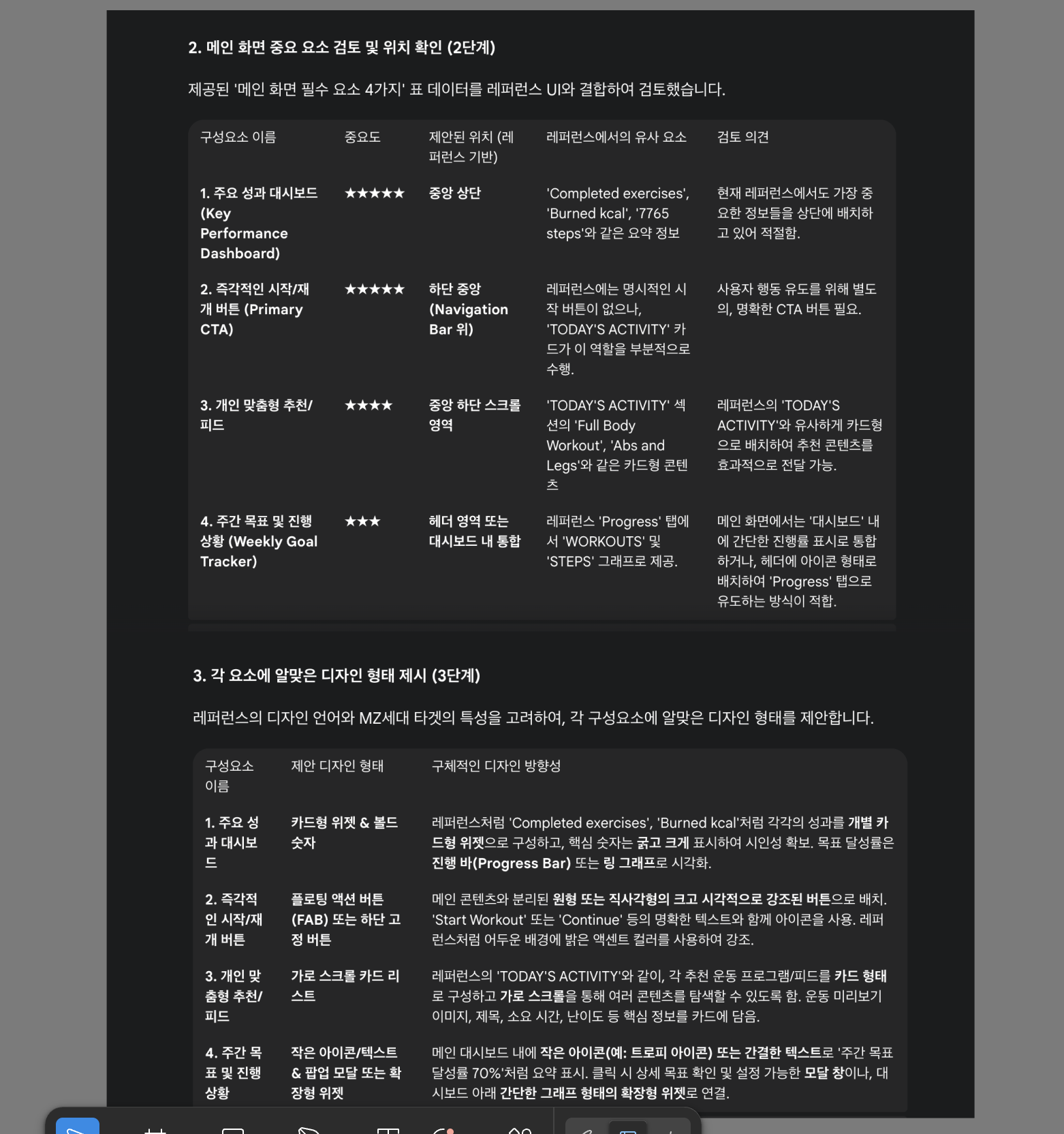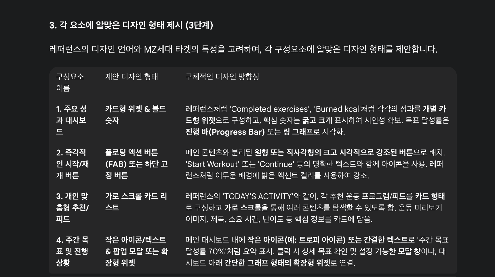 마지막 과제가 운동 어플 디자인이라서, 앞의 프롬프트 연습과 Relume 체험을 그와 관련해서 해보았다.