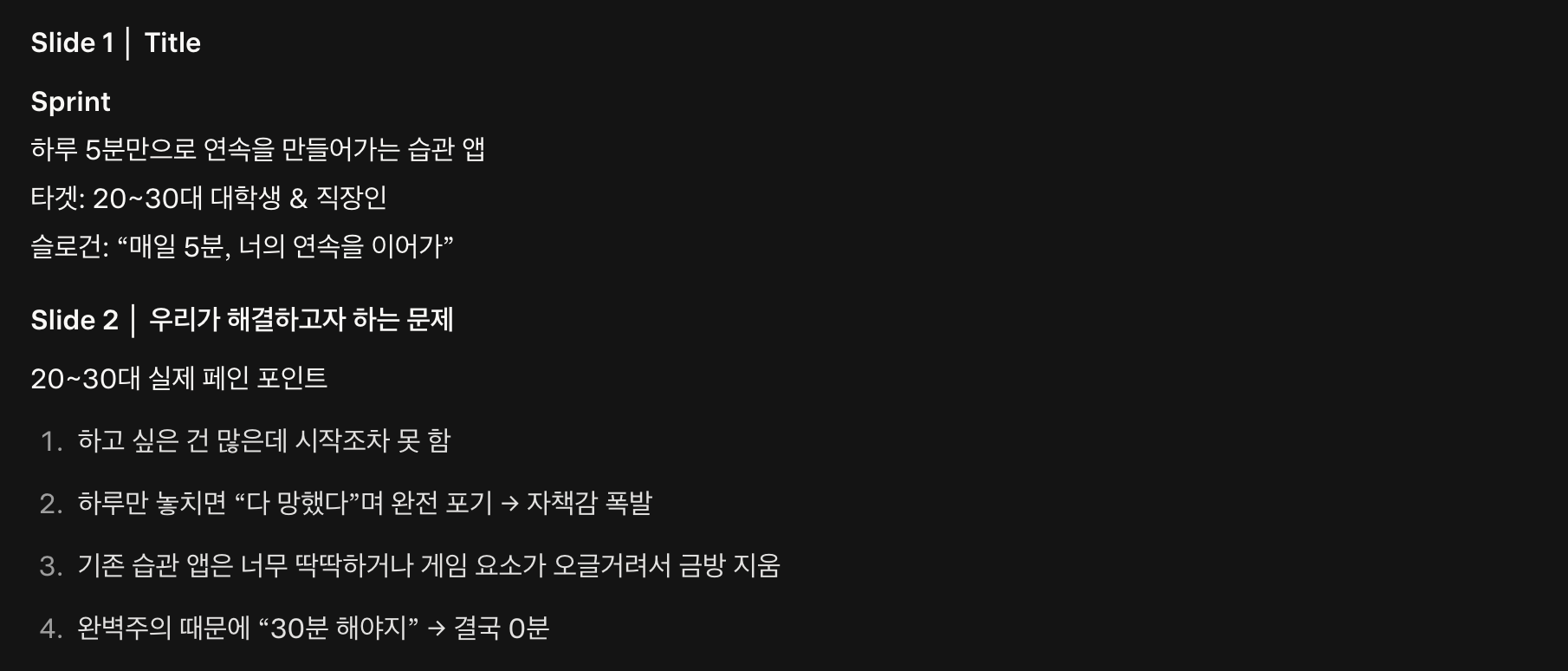 그록이 작성한 기획을 바탕으로 슬라이드별 발표자료를 요청했다.