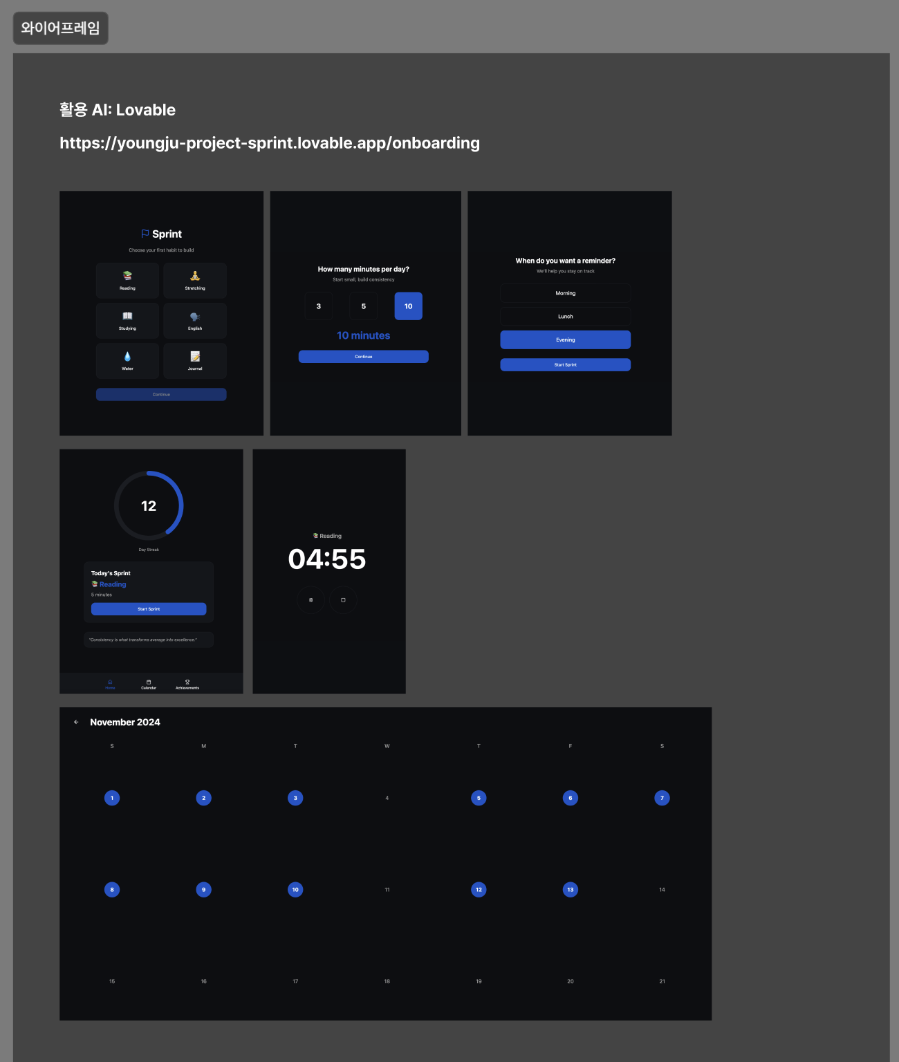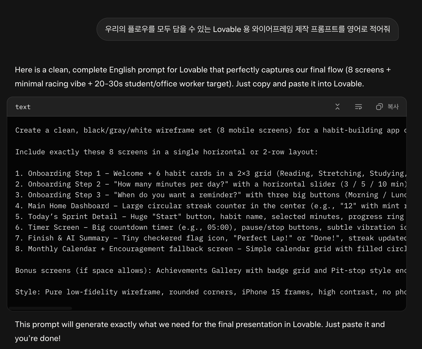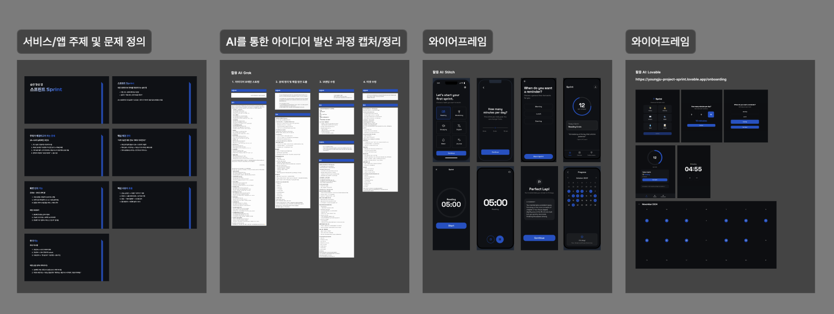 LLM 등으로 아이디어 발산 → Lovable/Midjourney 등으로 와이어프레임 생성