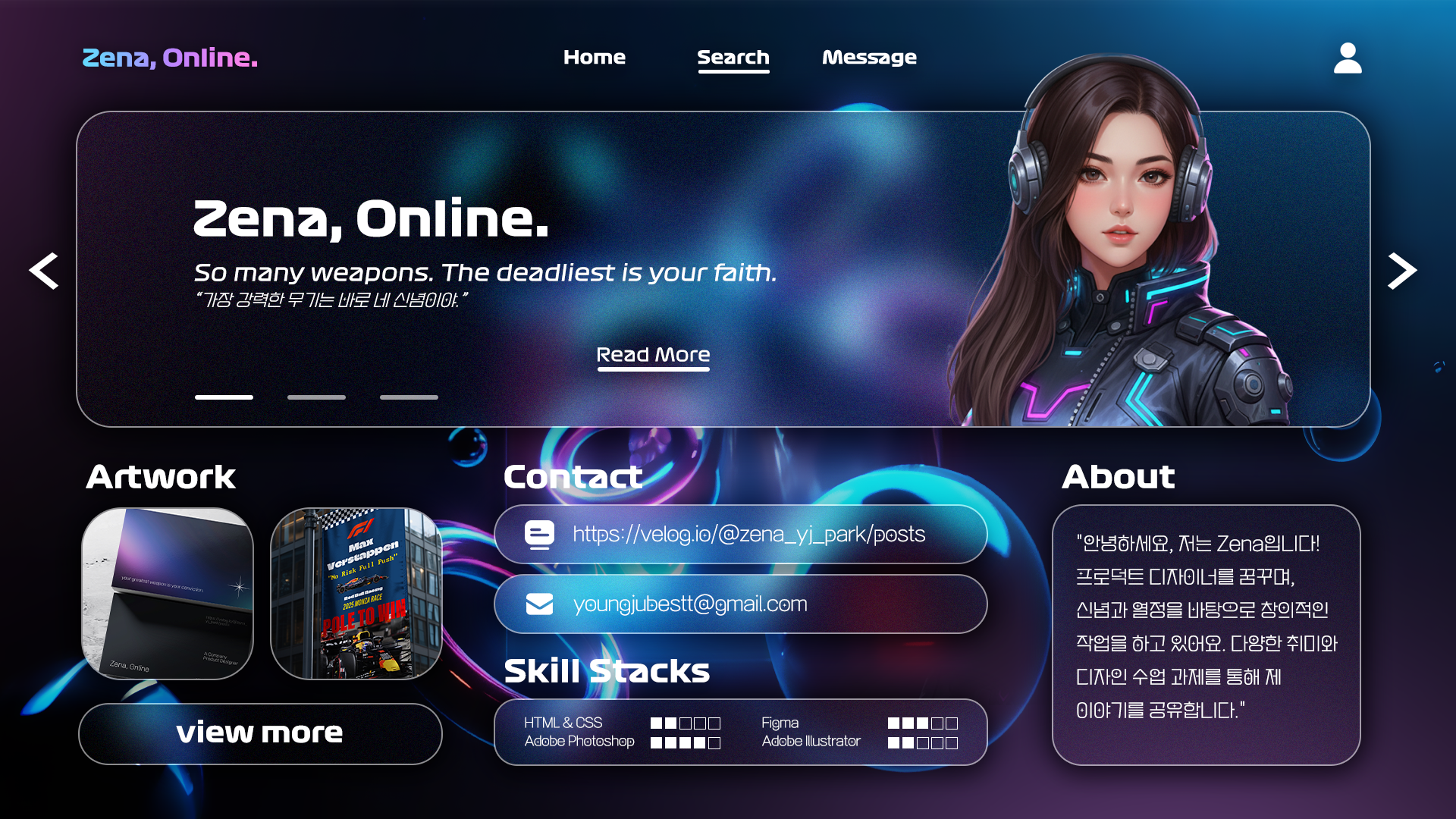 목적: 프로덕트 디자이너를 꿈꾸는 Zena의 포트폴리오 웹페이지로, 디자인 수업 과제, 블로그 링크, 취미 등 다양한 프로필을 소개하며 개인 브랜드를 구축.