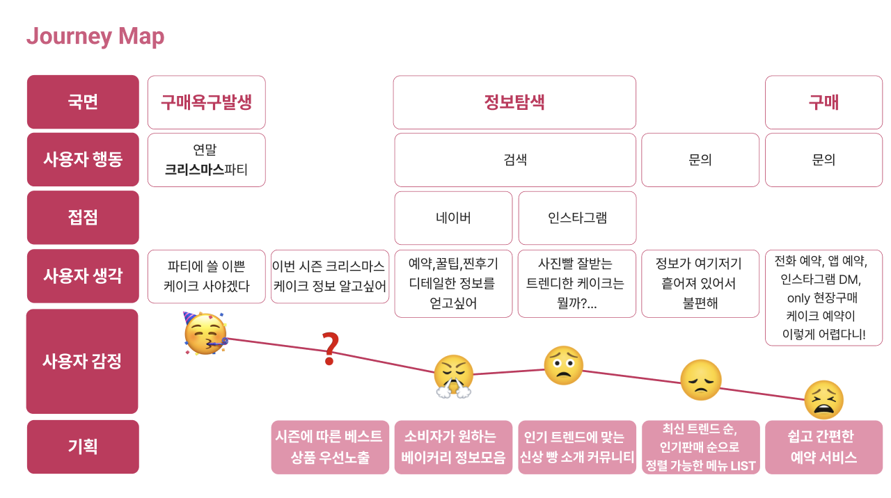 사용자 여정(User Journey Map): 사용자가 서비스를 경험하는 흐름을 단계별로 정리