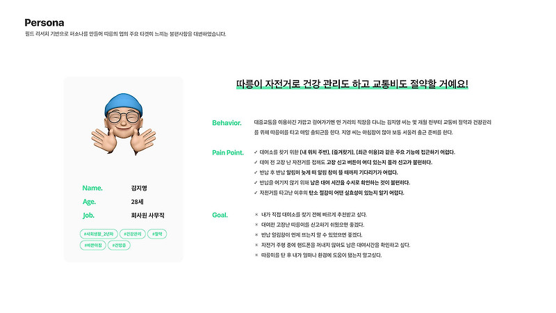 페르소나(Persona): 특정 사용자 유형을 대표하는 가상의 인물 설정 → 타겟팅과 UX 설계 용이