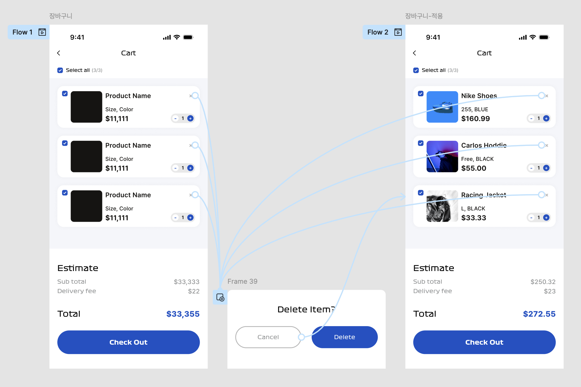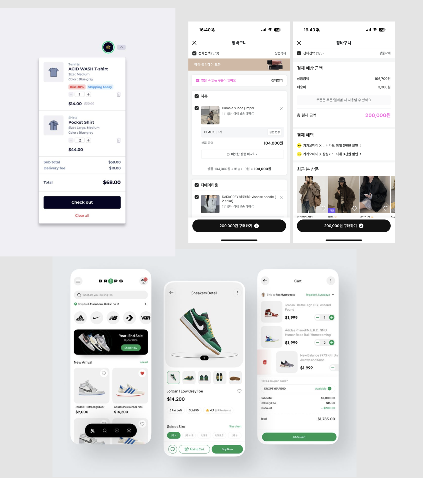 많은 브랜드는 결제 과정에서 장바구니(cart)를 사용합니다. 제품, 가격, 그리고 필요한 추가 정보의 배치 방식을 고려해보세요. 아래의 요소들을 고려해보세요.