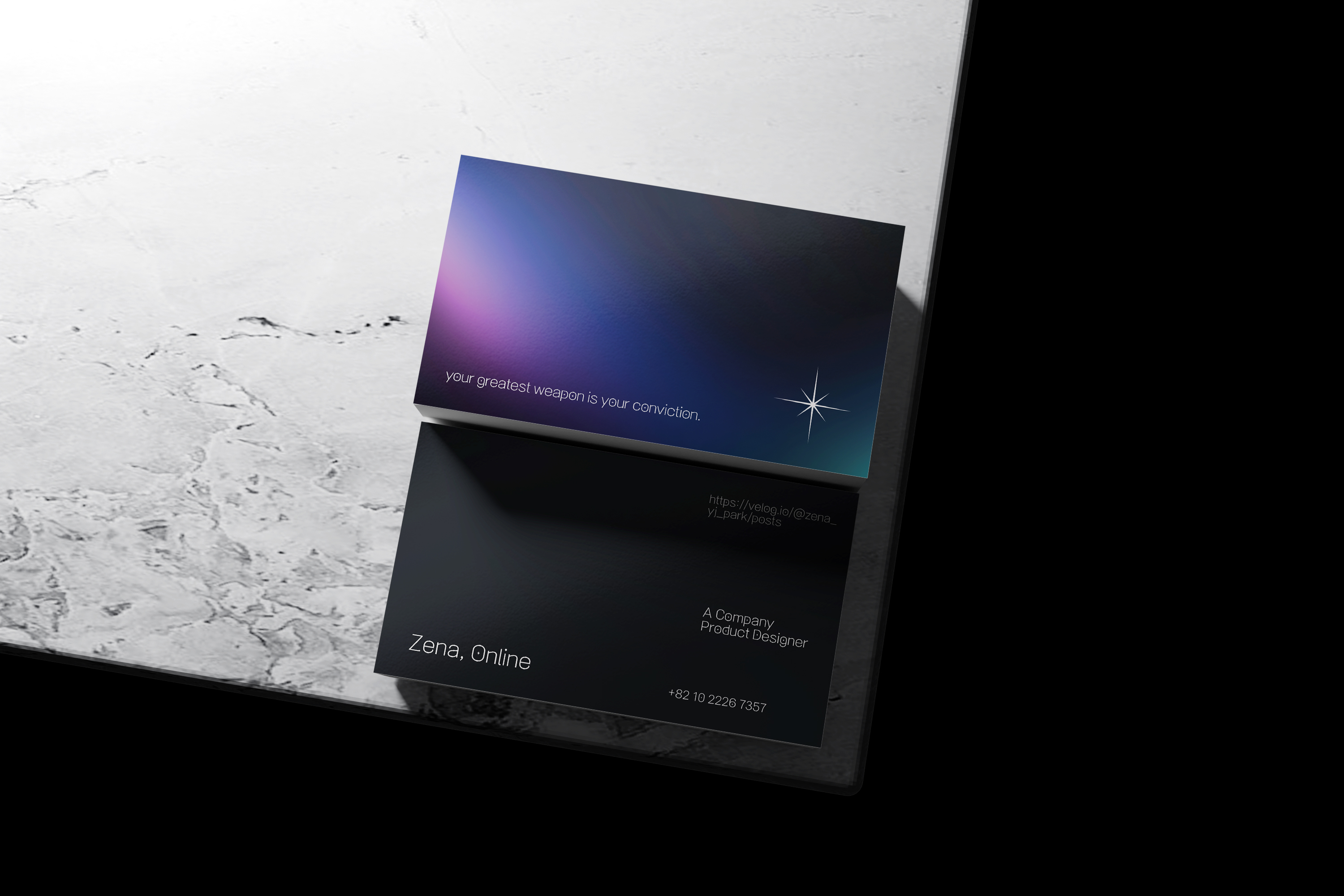 명함 앞면에는 내가 좋아하는 아펠리오스 픽 대사인 '가장 강력한 무기는 네 신념이야'를 영어로 넣어주었다.